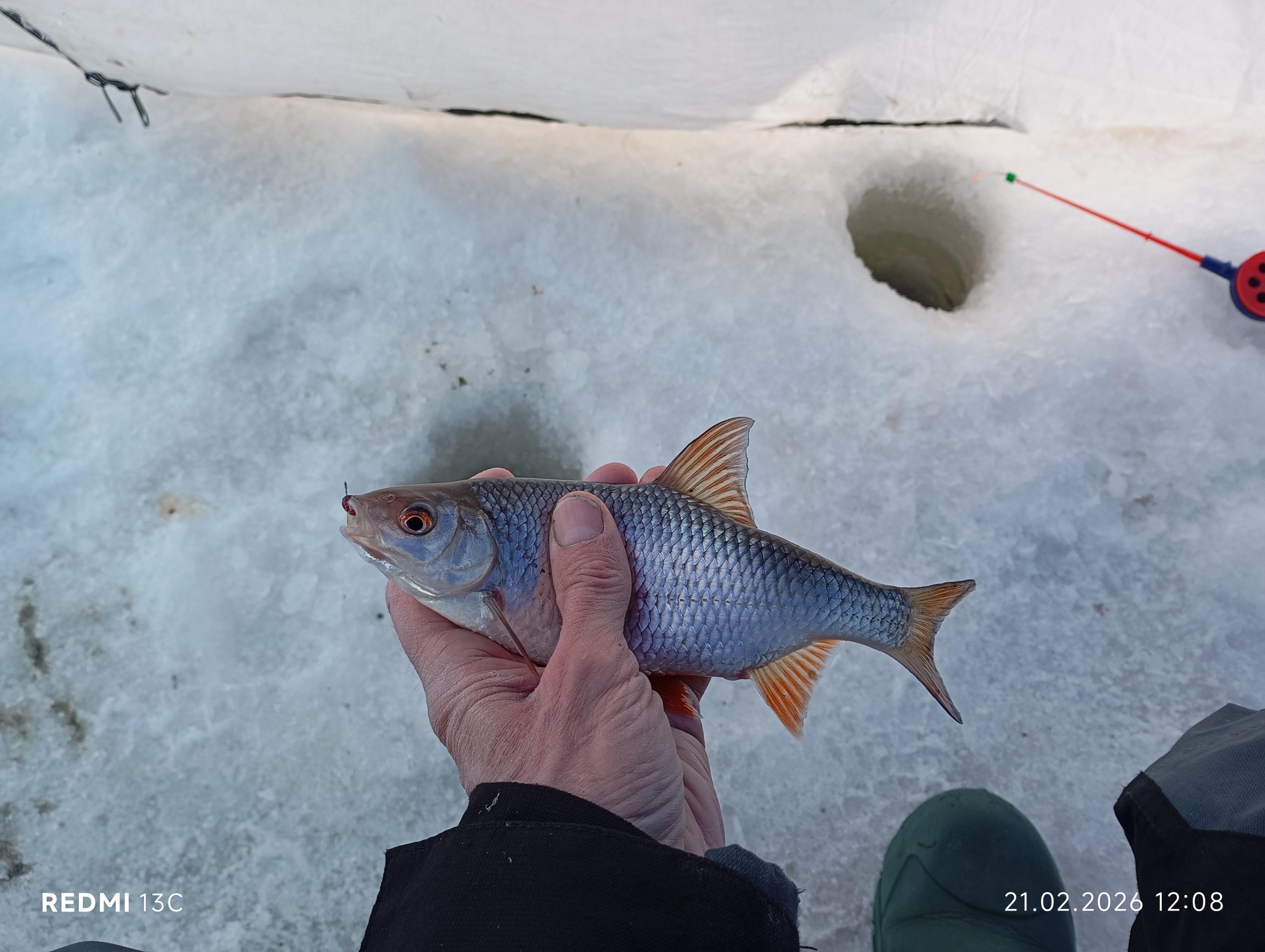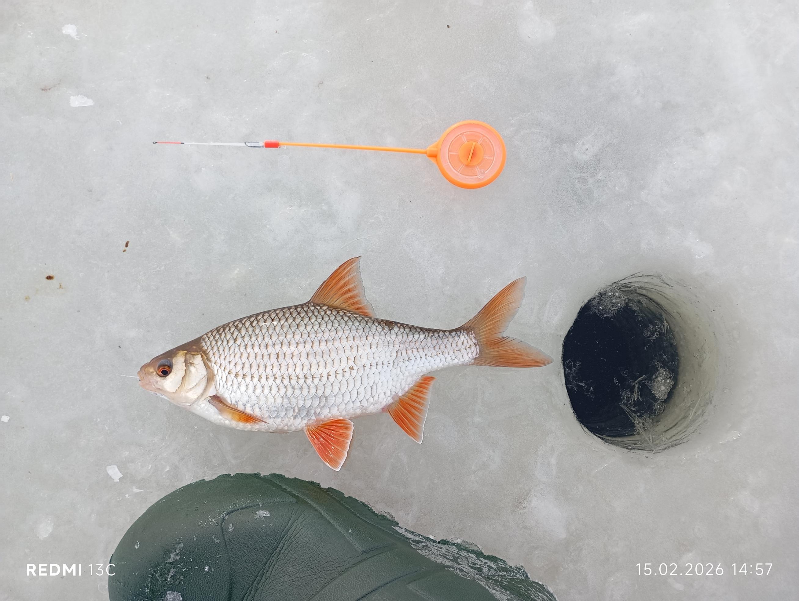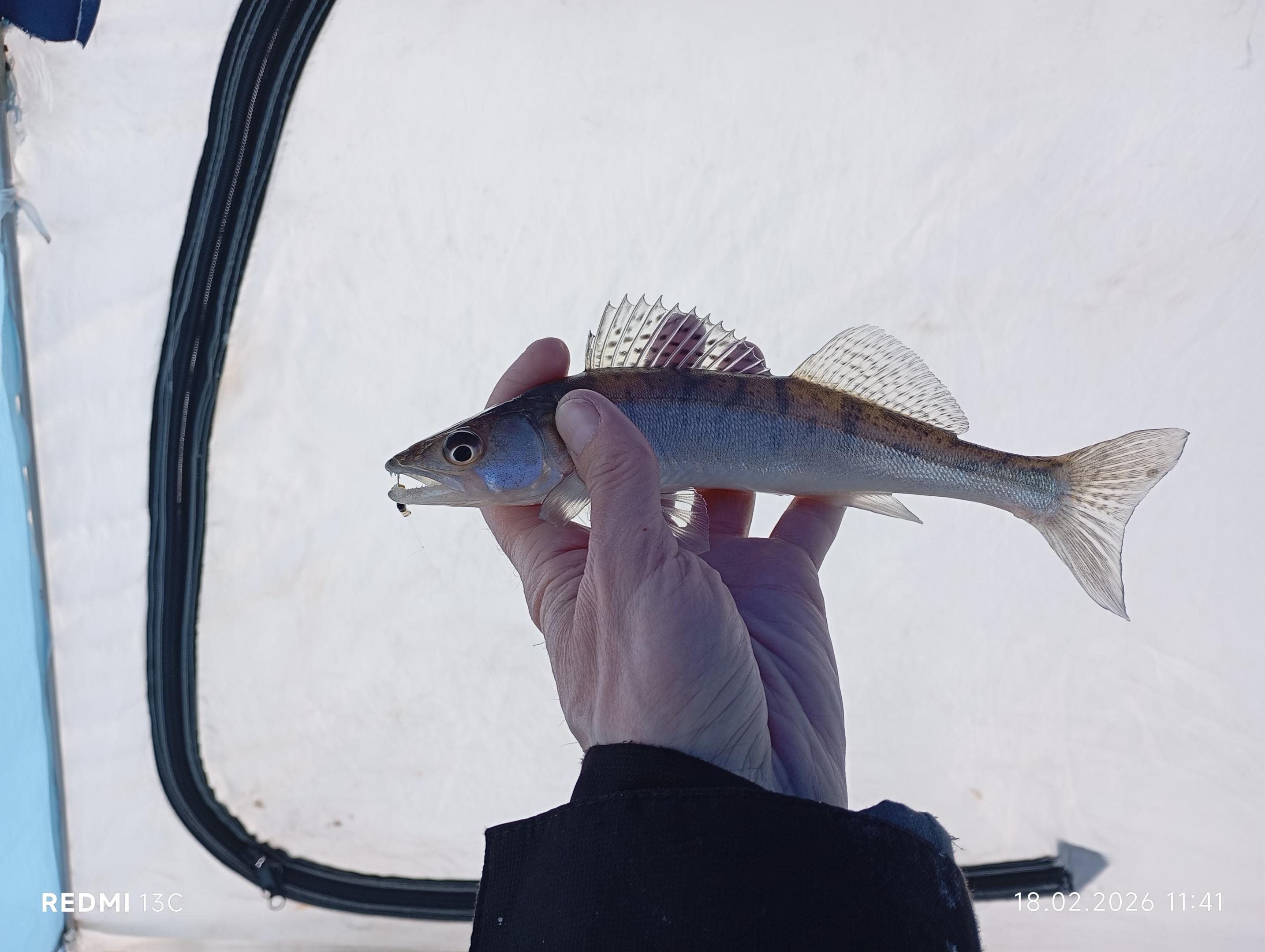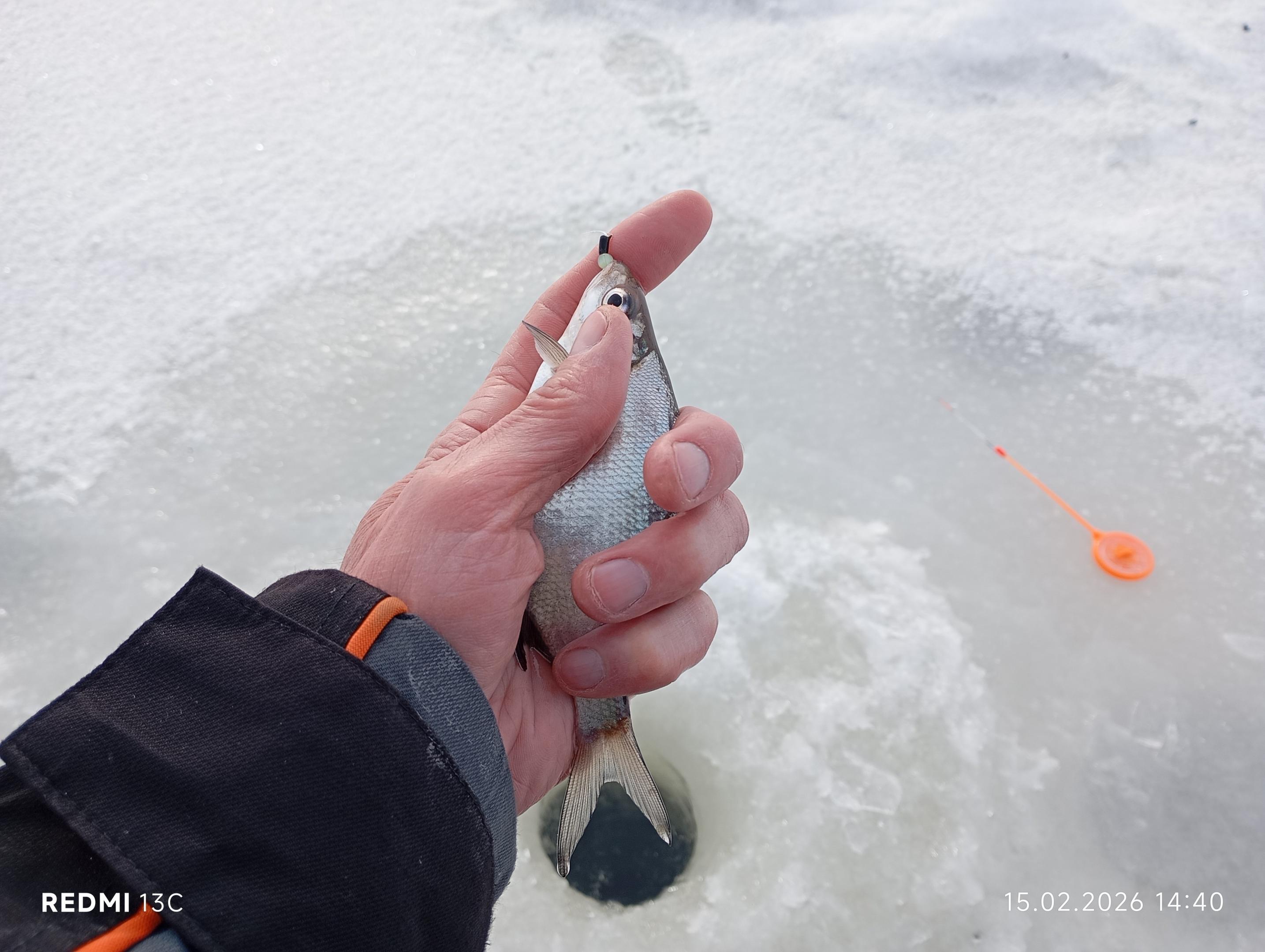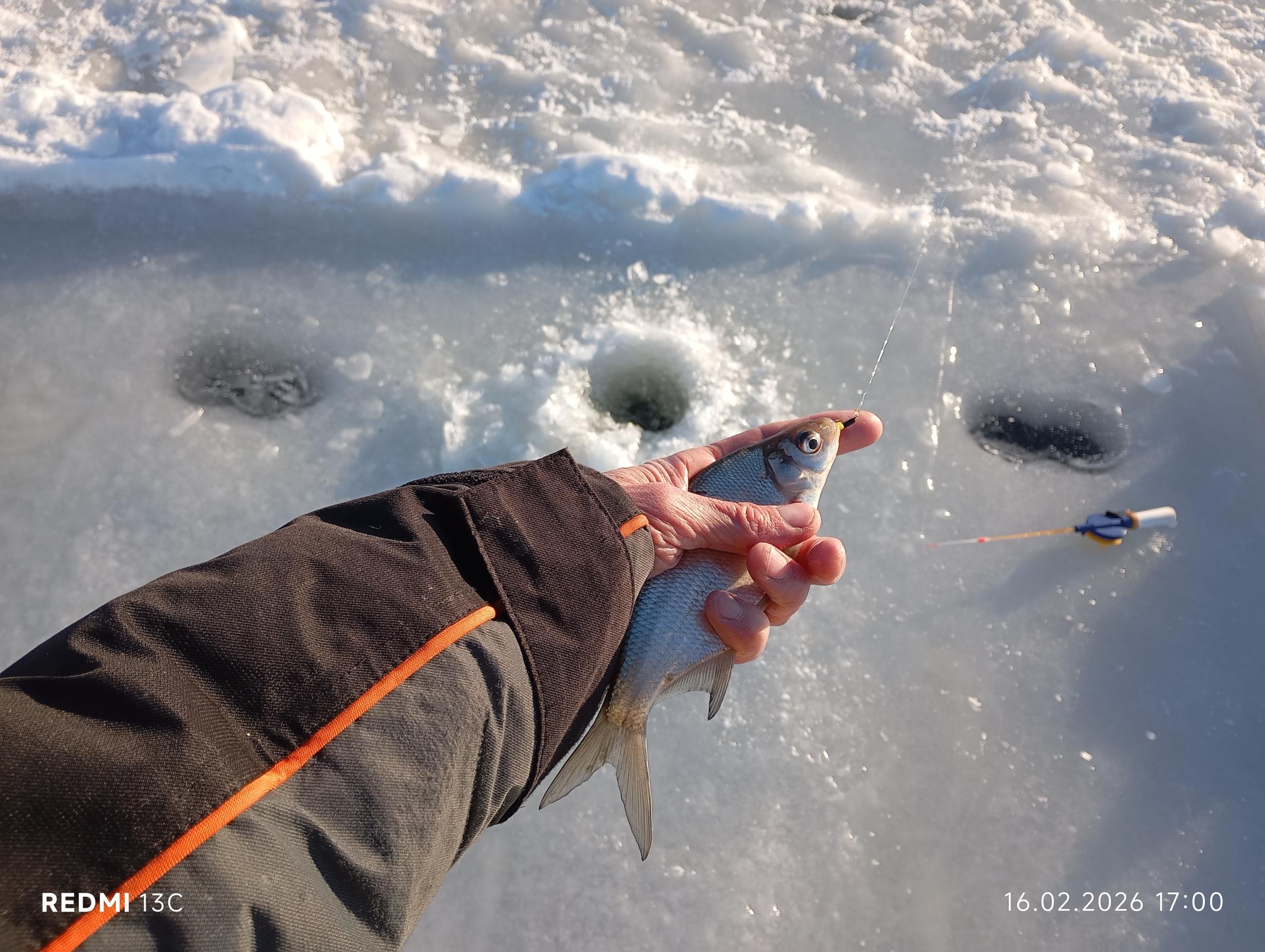 И на очередной лунке получаю таки пло́тную красивую поклёвку, вот и взо́рвана Вилейка первой моей ры́бонькой!