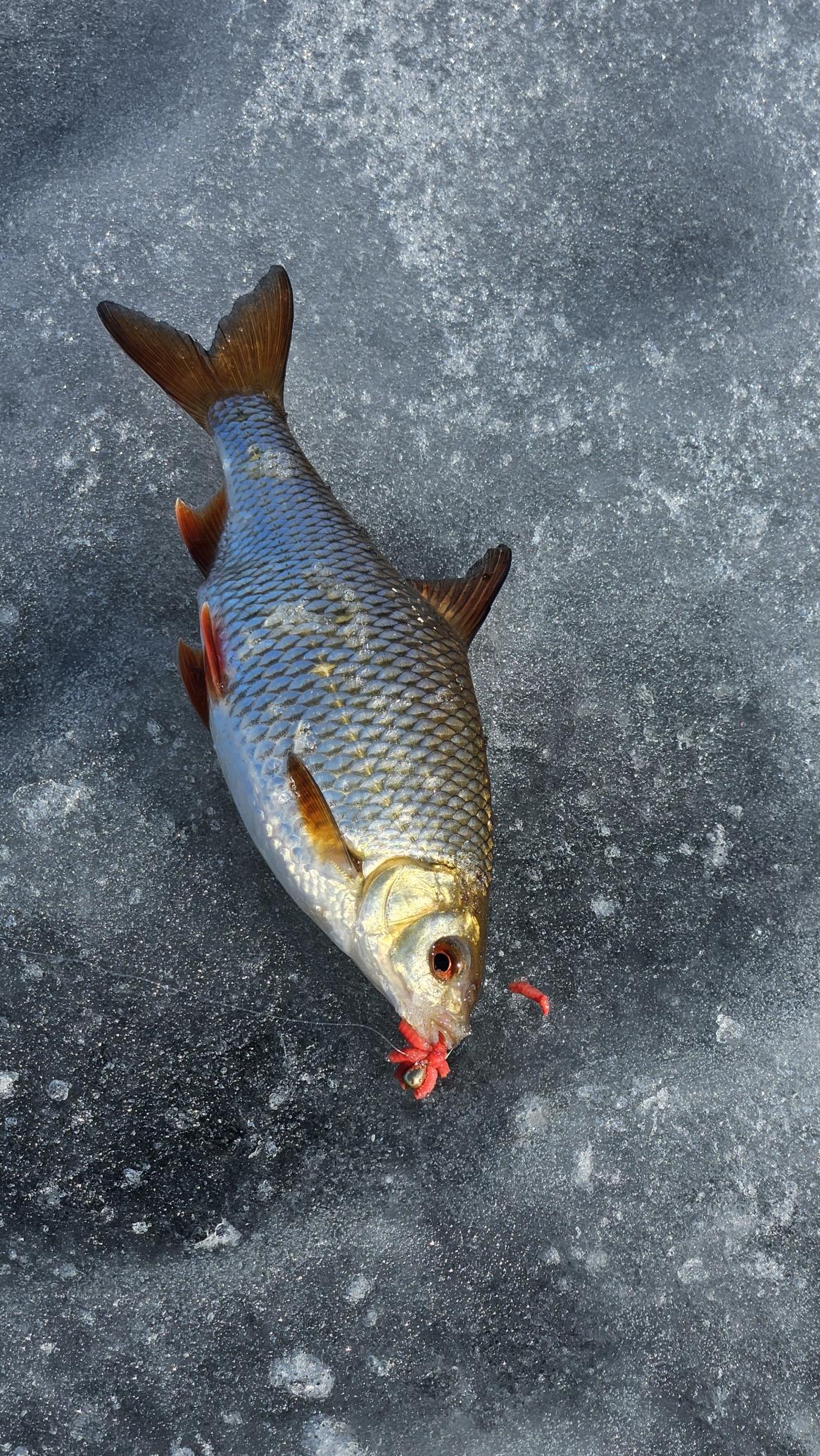 Прошел все шесть своих лунок, и везде клевало. Вот такая симпатичная плотвичка...