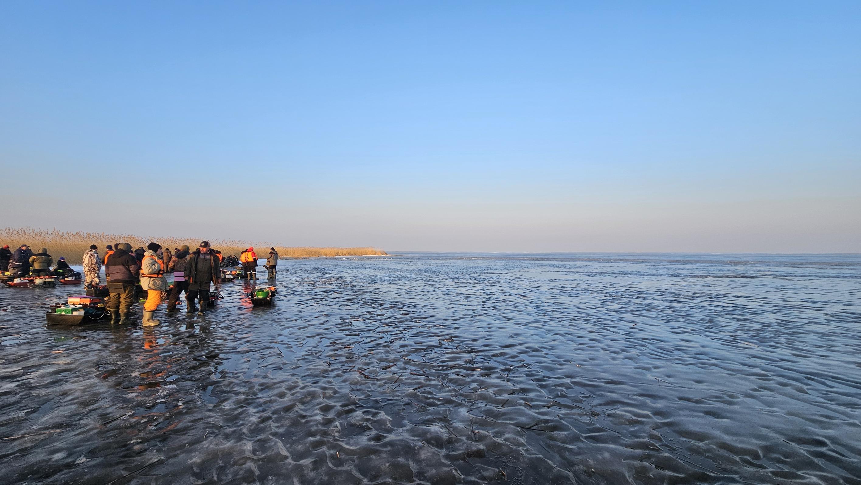 В Островцах на берегу народа уже много. Записываемся в очередь на развоз аэролодкой. Возят 2 лодки. Толпа народа, разбившись на партии, стоит в ожидании на льду, сразу за тростой.