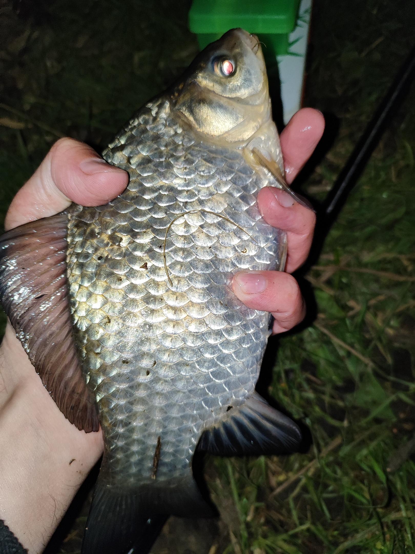 Как начало темнеть, хотел уже собираться, потому что после 8 поклевок не было вообще, но тут поплавок дрогнул. Это была не поклевка, думаю, кто-то задел леску. А вдруг это Рыба моей мечты? Я решил доловить до конца, тем более, что теста осталось на 4 заброса. На втором снова поплавок вздрогнул. Третий тихо. Наверное, ушла рыба... Последний заброс, тесто кончилось, начинаю потиху собираться. И тут поплавок выпрыгивает из воды и резко идет в сторону. По ощущениям что-то неплохое, но довольно быстро сдается - не гигант, но самый крупный на сегодня коросик) Отличное завершение рыбалки!