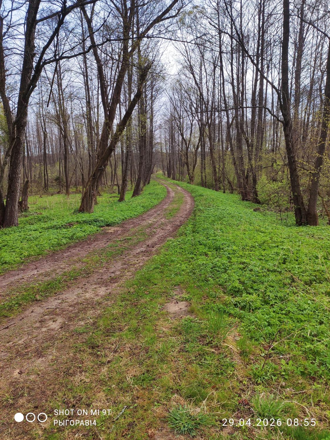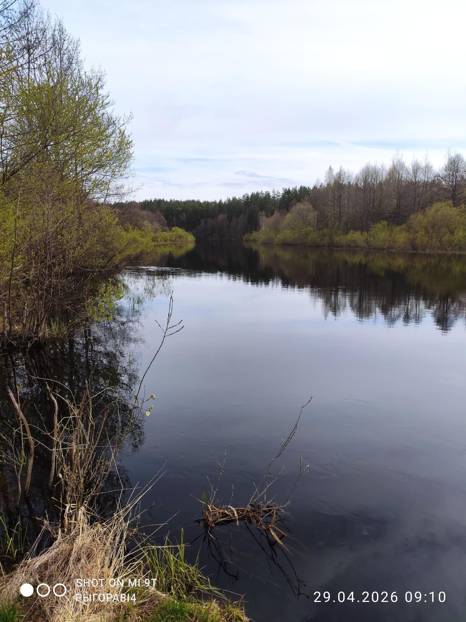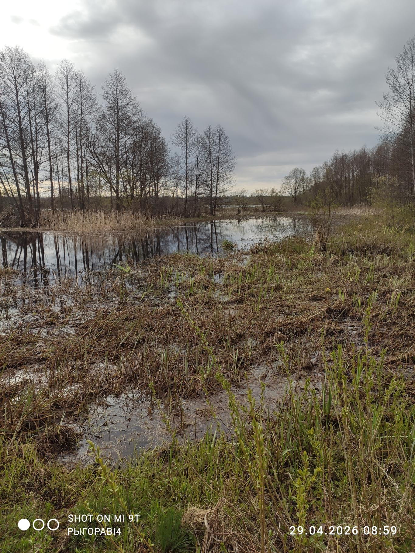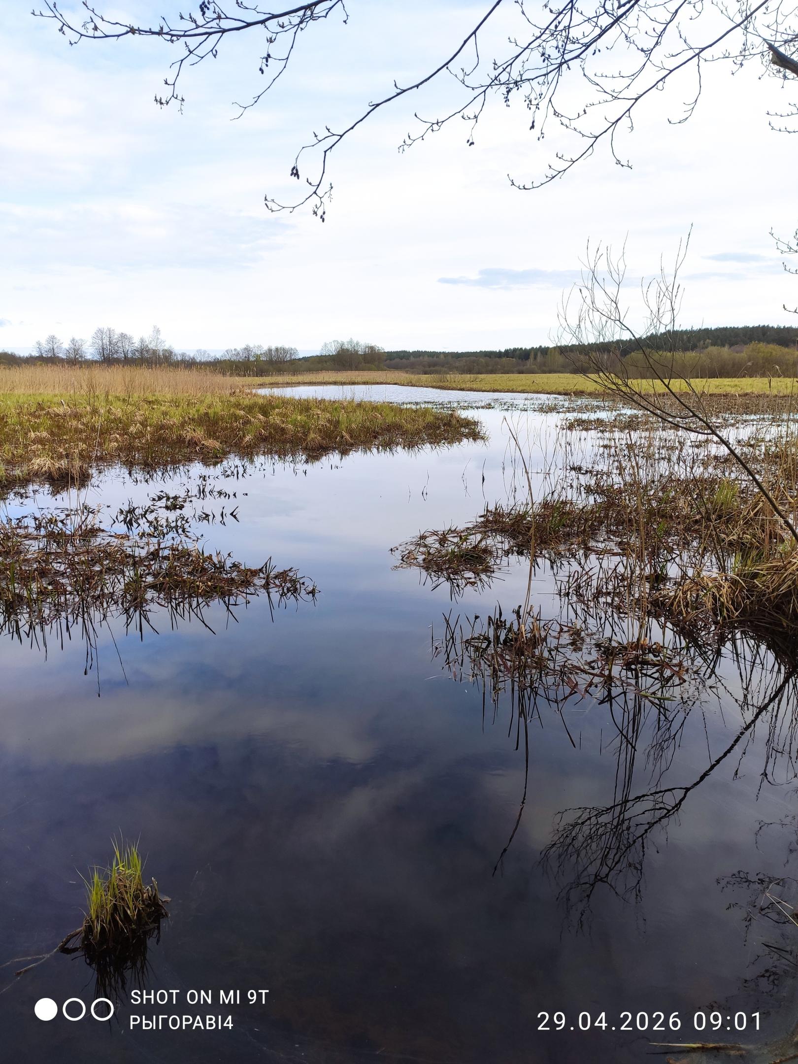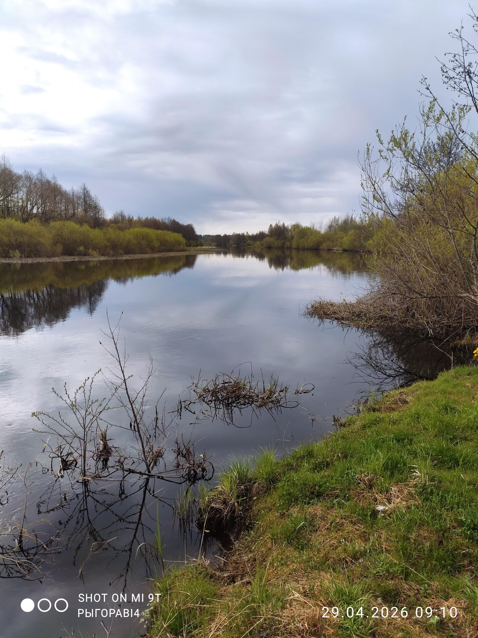 Но на рэчку ой как попасть хотелось, поэтому принимаю решение ехать на В. Березину в известное уже давно мне место. Сначала думал пойти на точку, где в прошлом году в это время клевали язи, но боялся, что с таким уровнем воды до реки не доберусь. Так, по сути, и получилось, из окна автобуса видел затопленную пойму, до реки только в заброд. Проехал чуть дальше и двинул на, как мне казалось, мелководный прогон. Лет 6-7 назад мы там купались летом и переходили реку туда-сюда. Идти от остановки всего два с хвостиком километра. Дорога, если не считать несколько огромных, но вполне проходимых луж, отличная.