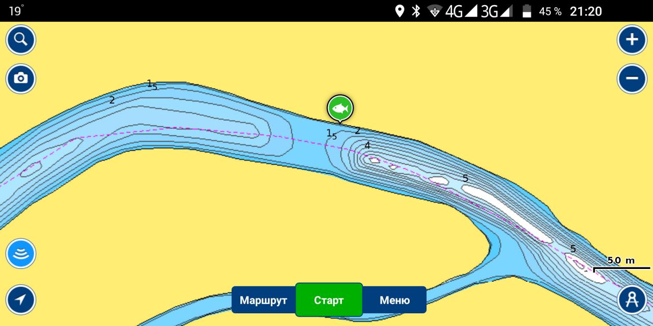 Первая точка (отмечено куда забрасывал, стоял на яме, почти где синий маркер), вход в большую яму. Глубина на точке - 1,5-2 метра, от силы. Голова 28гр быстро падала, течение небольшое.