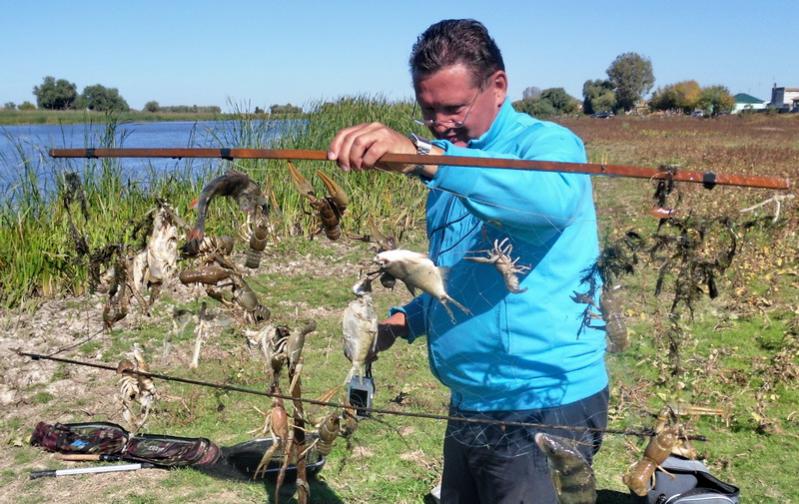 Ну,на сазана забросили,решили на фидер развлечься. Цепляю на крючок 1 номера десяток червей и забрасываю. Слово –прикормка ,здесь ругательное. Кормушки нет, только грузило. Фидер начинает колотиться еще в руках , а не на подставке. Ровно три секунды крючок побыл в воде ,а на нем уже висит местная густерина и нет ни одного червяка.:o Понятно.50 упаковок земляных червей мы везли абсолютно зря. Далее на них и не пытались ловить. Три-пять огромных кукурузин приносили тот же самый результат. Куда ни брось(под берег,на центр,к другому берегу),поклевка следовала немедленно. Обычно еще в толще воды. Да и тарань попадалась вполне приличная ,150-300г. У нас бы ловил и радовался. А там это надоело через полчаса. Товарищ спин достал. Пару раз махнул - щучка сидит. Грустно как-то.:( На сазаньи снасти все время кто –то теребит. Кивок дубовейшего спина всё время в движении. Но правильной потяжки всё нет. Товарищ вытянул чей –то «телевизор». Очень прикольно было. В сетке висит полный скелет щуки, пару живых окуней, пару полу съеденных густеров и полтора десятка раков.Нажмите на изображение для увеличения.