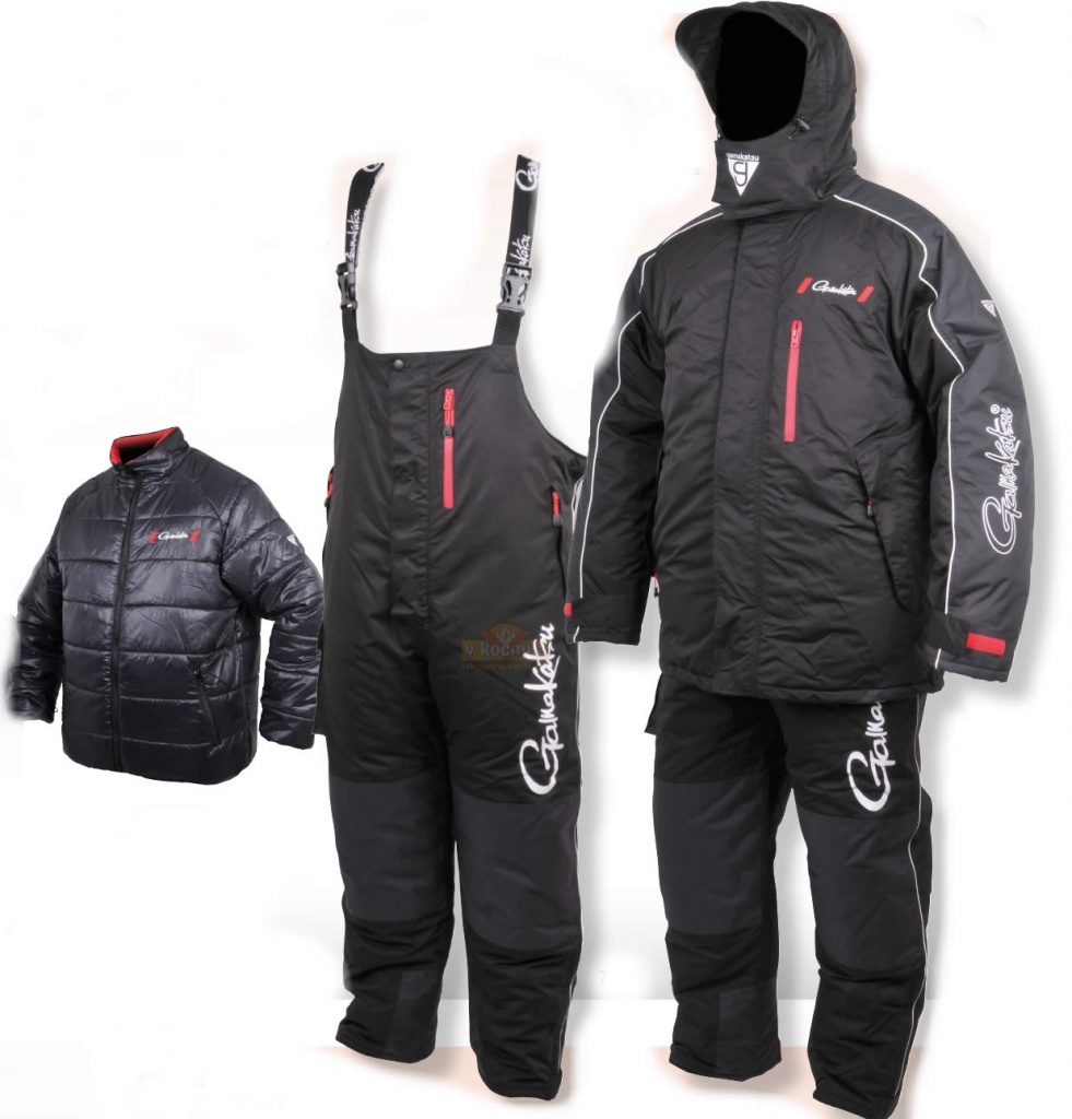 Термокостюм Gamakatsu Hyper Thermal Suit исключительно тёплый, состоит из термокуртки из материала 320T Nylon Taslon Gamakatsu на теплой и мягкой флисовой подкладке, легкой съемной куртки и комбинезона, рассчитан на мороз до -30° C. Обладает \\\"дышащими\\\" свойствами (5,0 л/м2/24ч) и водостойкостью (5000 мм). Имеет дополнительный слой полиэстера. Нейлон отлично защищает от ветра, быстро сохнет, обеспечивает теплом и хорошим воздухообменом, а мягкий, нежный и теплый флис с начесом прекрасно отводит влагу от тела. Съемная легкая куртка одевается под термокуртку для полной изоляции теплого воздуха внутри костюма, в легкую весеннюю погоду может использоваться самостоятельно. Дополнительным утеплителем в костюме является полиэфирная начинка, в куртке 180 гр и в брюках 160 гр. Костюм оснащен внешними и внутренними карманами на водонепроницаемой молнии, нижняя часть брюк имеет боковые молнии и расстегивающиеся пряжки на липучке для фиксации брюк по ноге. Куртка имеет отстегивающийся капюшон с раскладным козырьком, высокую стойку-воротник, которая не пропускает ветер и влагу и неопреновые фиксированные манжеты, плотно прилегающие к запястьям. Молнии: водонепроницаемые от японского бренда YKK. Выпускается в двух расцветках: Gamakatsu Hyper Thermal Suit черного цвета и Gamakatsu Hyper Thermal Suit Khaki цвета хаки. - Температура комфорта до - 30 °С.
