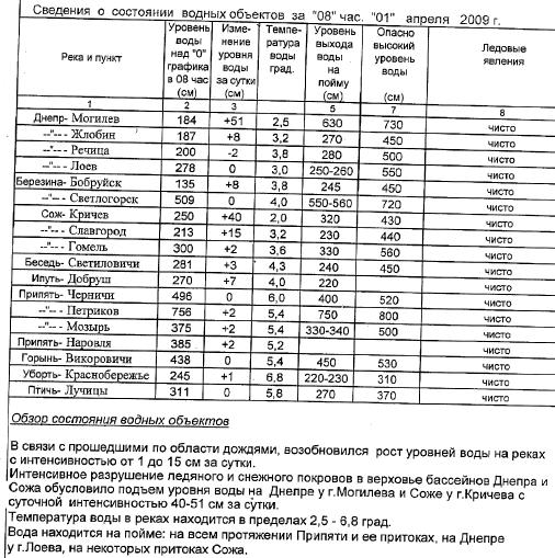 • Сведения о состоянии водных объектов за "08" час. "30" марта 2009 г.