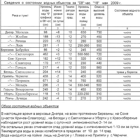 Их там никогда и небыло :(.Дальше читайте внимательно:выбираете реку (гидробюллетень 18,05,2009)-открываете архив гидронаблюдений (pogoda.by)-задаете период (18,05,2009 включительно)-вкл.калькулятор и считаете-получаете интересующую цифру...согласитесь, не сложно;).Но надо иметь ввиду что некоторые реки либо отдельные участки,например верховья Днепра,Зап.Двина могут прибавить за несколько дней весьма существенно...а по выходным pogoda.by почему-то брезгует инфу получать,размещать :o... хз :(.Так что метод описанный выше не самый "правильный",но единственный :(,который лично я знаю.Может кто что-нить толковее предложит.Успехов.