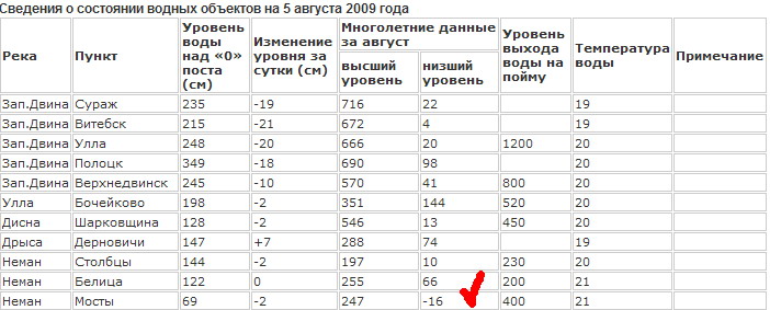 • Дождались таки, на www.pogoda.by в блоке информация специалиста-гидролога выложили таблицу "Сведения о состоянии водных объектов на 5 августа 2009 года".