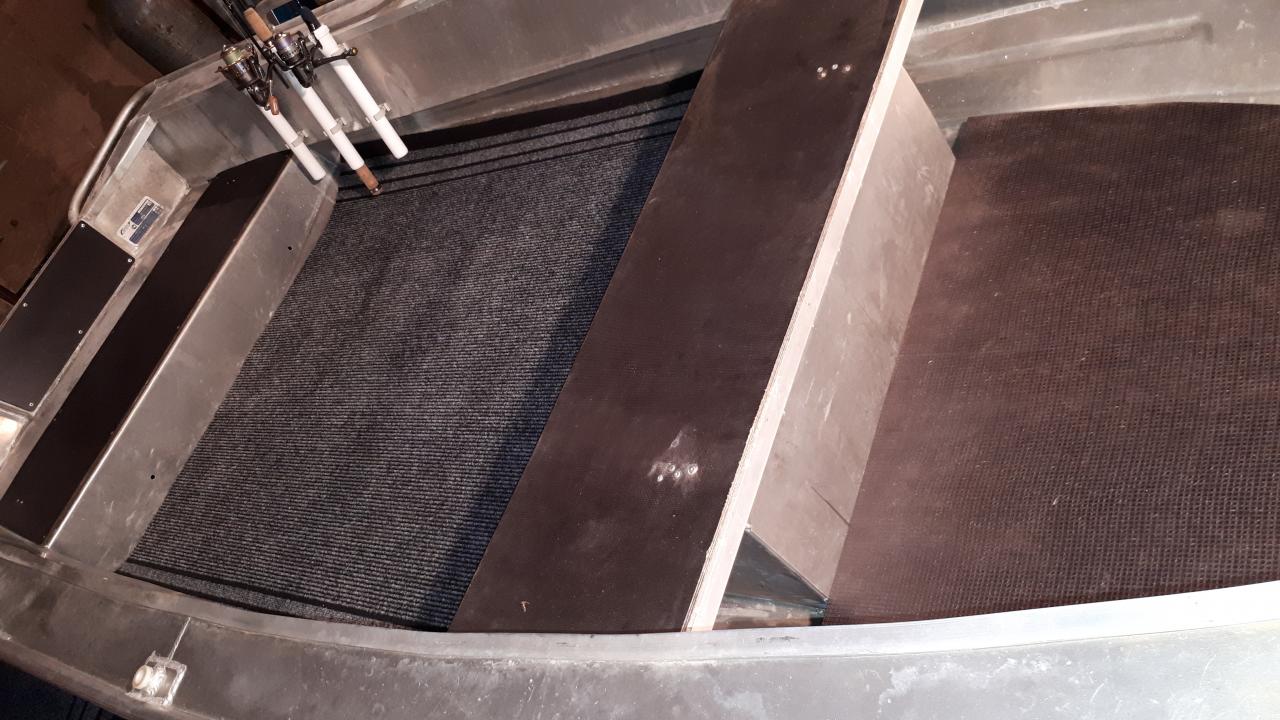 Заводское покрытие в 6 мм заменено на финскую влагостойкую фанеру с рефлением в 12 мм. Поднята палуба. Сплошной ровный пол по всей длине лодки.