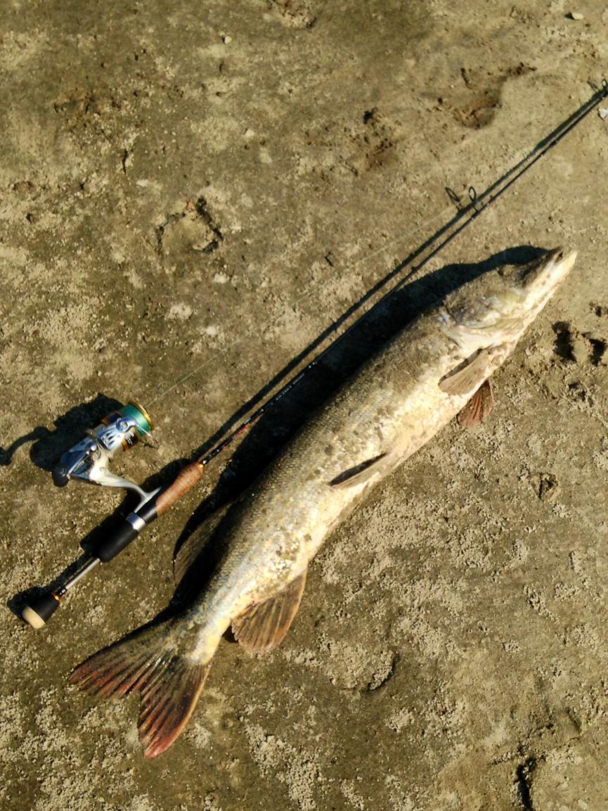 Вот река уходит налево, образуя прямую песчаную полосу за которой на всю длину углубление и на вид по пояс минимум. Занимаю удобную позицию, начинаю облавливать. Раз заброс на мель и стягивание в ямку, два, три…. Семь…. Десять… и на забросе номер х когда я уже швырнул на середину реки и расслабленно выматывал плетню и присматривал куда идти дальше или собираться домой. Происходит уже обычный, но такой и необычный мягкий стоп. Только на этот раз мертвый, ну думаю, поймал корч, принесенный на меляк, упираюсь и тяну на грани спиннинга, что бы попытаться отцепить. Как в друг мысли сходятся с реальностью и корч начинает плыть в низ по течению, а я все не могу поверить, что это рыба.. но начинаю приходить в себя, и потихоньку зажимаю фрикцион.. и придерживаю рукой, боясь, что пойдет дым. Понимаю что это не жерех, но не капельки не расстраиваюсь, а в голове, ЩУКА! –да нет, она бы проявила себя, а тут как будто и СОМ!.- да наверное он потому что идет как бревно… рука начинает затекать и я упираюсь ручкой спиннинга в живот, вздыхаю и нервно, но уверенно, как будто, каждый день это делаю, продолжаю контролировать «баржу», а говорили баржи не плавают уже, еще как плавают смеюсь сам себе… выматывая метр за метром. Вот уже расстояние критическое и я скоро увижу кто это…. Нууу… чуть-чуть….ЁЁЁЁЁпт Щука!!! И в секунду вспоминаю что поводки не использую вообще…. Начинаю нервничать, но по сантиметру подтягиваю к берегу спиннинг не рассчитан волочь монстра такого. Тяну и знаю что однозначно сейчас будет рывок от берега, ну никак без этого, а поводок то не появился и может быть все плачевно… незамедлительно следует рывок и рыба уходит в яму и выше по течению плыть вздумала, кое как разворачиваю и сие действо повторяется еще несколько раз. Сил уже совсем нет, нервов тоже. И она сдается, наверное жалея меня, и ложится подбородком на золотой песок, разрешив аккуратно взять себя за голову…