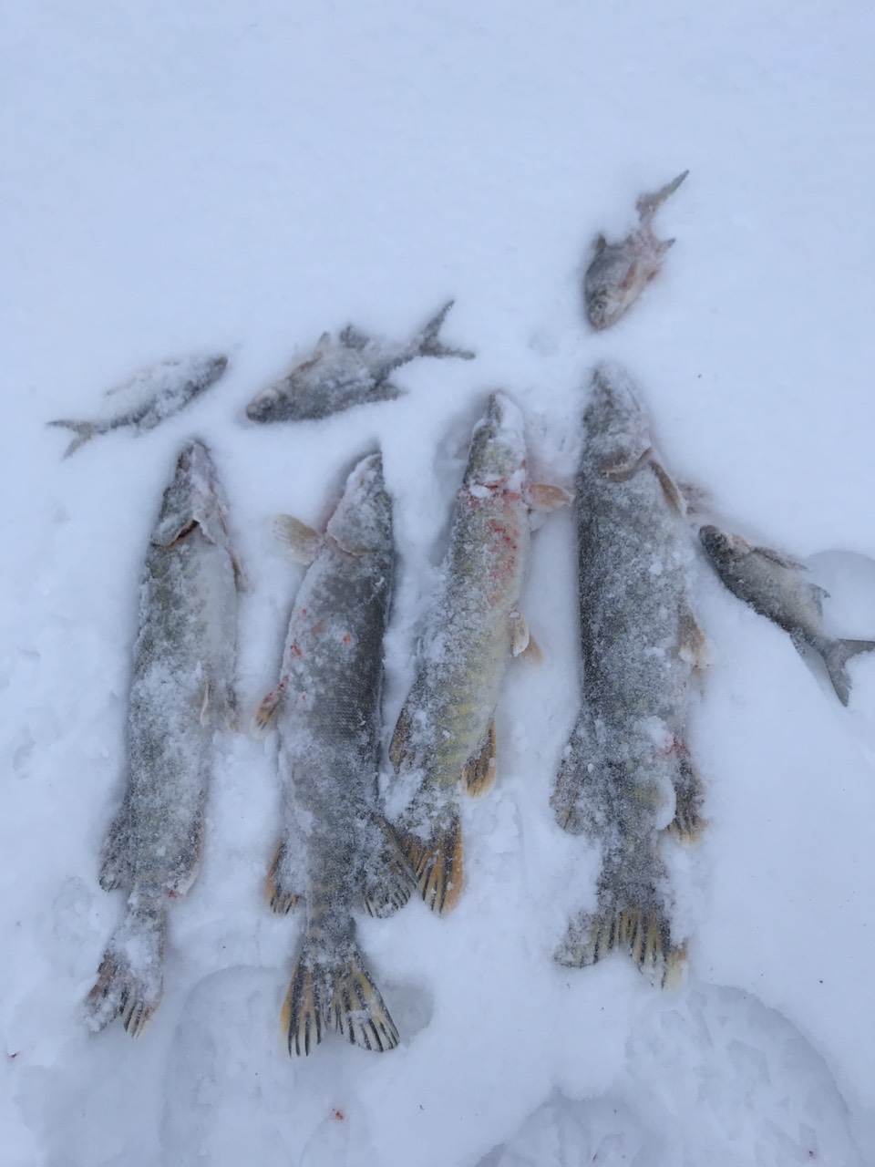 Как-то не доводилось на Свири зимой охотиться на щуку, сегодня впервые. Целью было наловить живца, который неплохо отзывался возле камыша. По щуке две полторашки, два килограмовика. По глубинам насколько я понял неплохо отлавливались по подлещику( сам видел как прятали полные пакеты.) По льду везде около 10 см., меньше не встречал.Нажмите на изображение для увеличения.