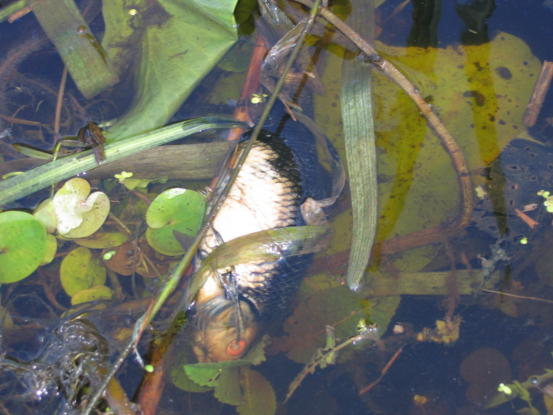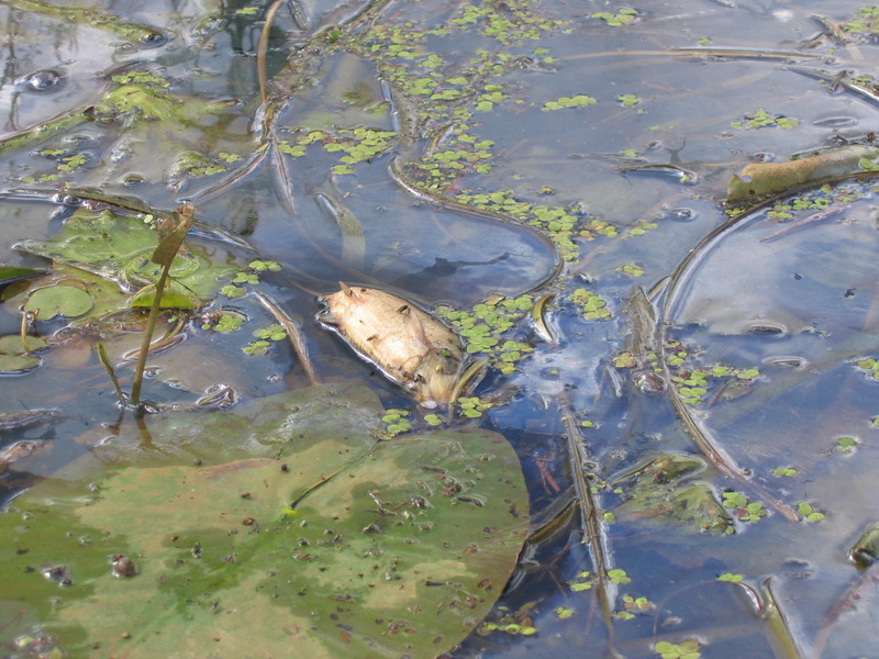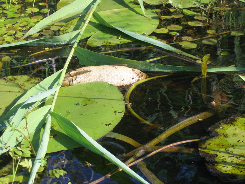 P.S. Это только малая часть, уже выплывая на берег сфоткал. Когда веслом разгребаеш траву и ряску возле берега, сразу видишь кучи дохлой рыбы:( Я приехал рано утром еще темно было спустился на воду, как рассвело - увидел что ловить там нечего(да и смотреть было больно на мертвую реку) и сразу же собрался домой. К сожалению вот такой отчет а не отчет о пойманной рыбе.