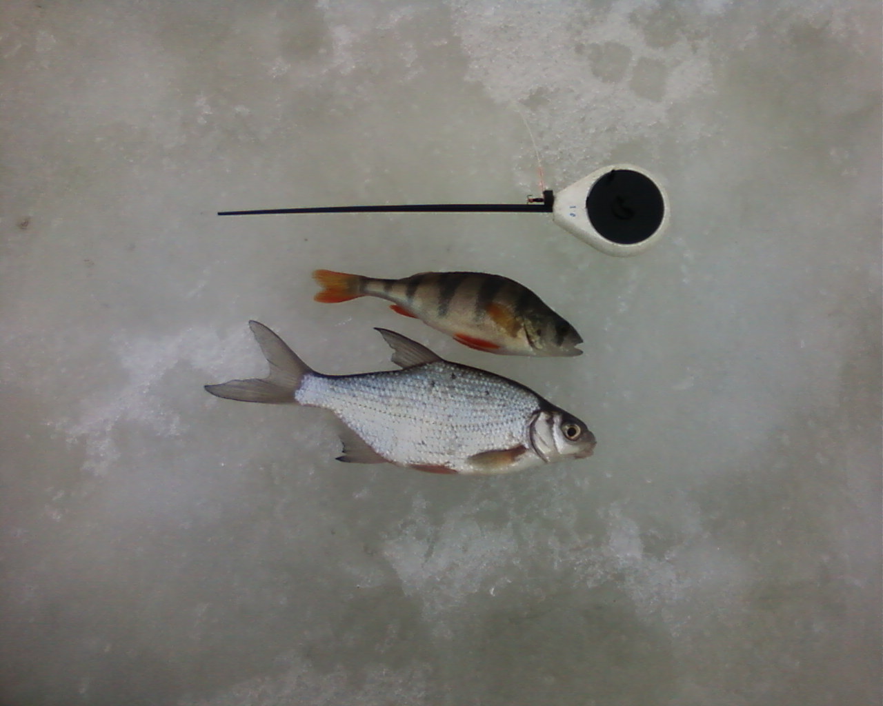 • Сегодня удалось 10 минут порыбачить возле д. Русаковичи. Успел с одной лунки выхватить две рыбки. Был это неистовый клев или просто с лункой повезло кто его сейчас разберет. :( Ловил на чертика на границе течения и спокойной воды.Нажмите на изображение для увеличения.