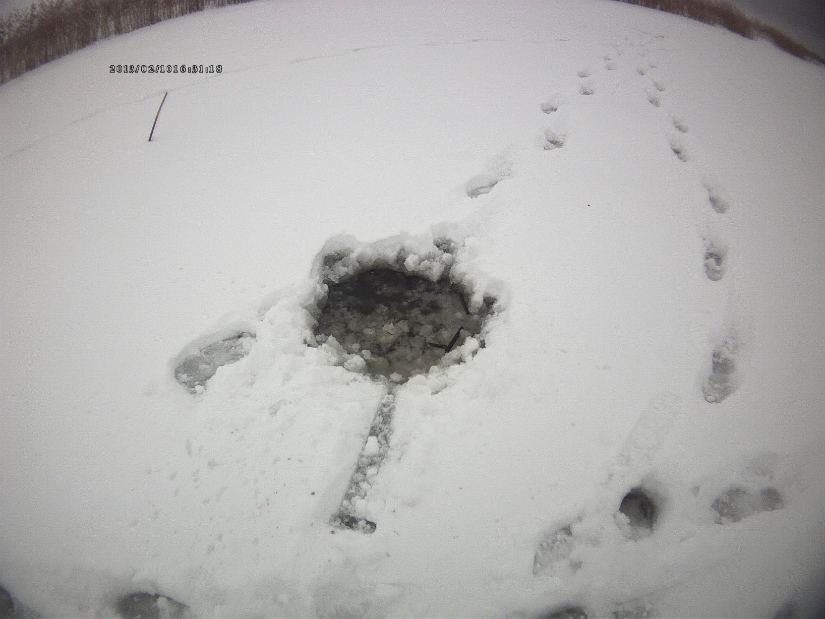 Туман. Решил возвращаться. Выхожу на яму и натыкаюсь на четверых "демонов"- одна удочка на всех. По всей яме на старых лунках разложены мотовила с ниткой. Огорчившись отсутствием клева, мерзкой погодой и наглостью "залетных" прошел мимо...