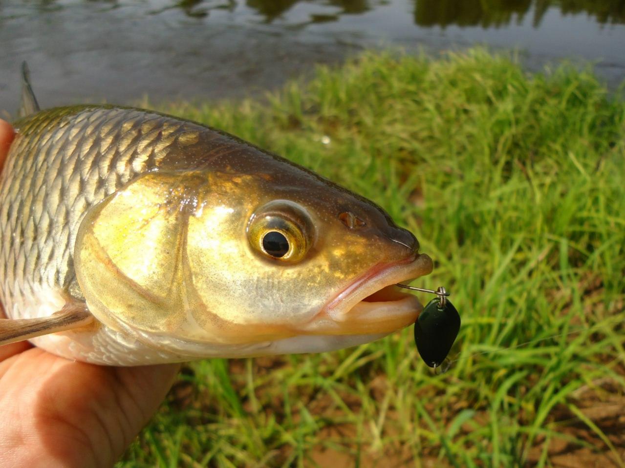 Теперь немного фактов, как же говорил выше, целенаправленно голавля я ловил впервые. Поэтому надо было выдрать из памяти все прочитанное и услышанное об этом ранее, внести коррективы по месту и реализовать. В основном работал стандартный способ: заброс выше предполагаемого места стоянки голавля, очень медленная проводка на снос, чаще вообще без подмотки лески катушкой, по дуге. Причем дуга должна проходить как раз в месте предполагаемой поклевки, в этом месте делаем полную остановку проводки и ждем поклевку, также срабатывали легкие подтвичивания в этот момент. Также хорошо работали проводки апстримом где-то под углом в 30град к себе, и опять же медленная проводка с подтвичиваниями и паузами. Кстати о поклевках, они скорее напоминали собой сбой в игре приманки, потяжку либо зацеп, реже это были ударчики, причем как правило это были некрупные особи. С чем это связано трудно сказать, либо с тем, что у меня было монофил, а может с тем, что маленькая колебалка напоминала голавлю кормовой объект, который не требует агрессивной атаки, что, кстати, более вероятно. За время проживания на реке вода упала сантиметров на 20. И если в первые пару дней голавль брал в основном перед перекатом, то потом сместился ниже его и ближе к форватеру, так что доставать его становилось сложнее, особенно учитывая запрет на заход в воду. Опять же скажу по поводу безбородых крючков, по их вине не было слито ни одной рыба, зато если планируете рыбу отпускать, то с ними делать это очень удобно в особенности из-за мясистой пасти голавля. В общем, за пять дней на реке было поймано порядка трех десятков голавлей разного калибра и за исключением 5 штук все были отпущены.