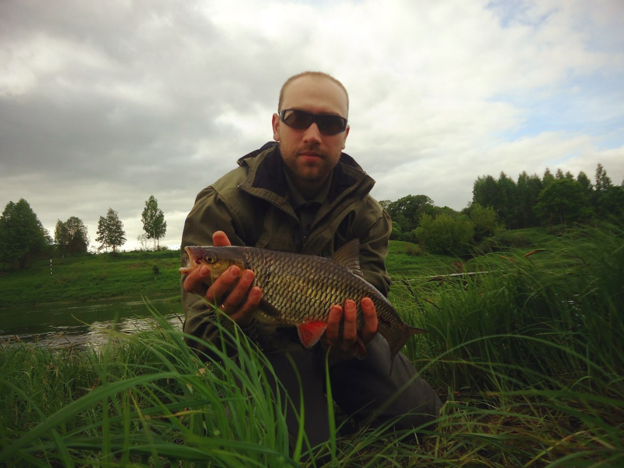 Но вот 7 вечера, приехали дорогие сердцу люди «…и настроение мое улучшается…». Отжал у Миши блесну еще одного российского производителя Пирс латунного цвета и Flash Line 1.6гр от SV Fishing, показал «городским» где ловить и мы разбежались. Андрюха, как говорится не отходя от кассы на роджера от косадаки ловит шнурка, а я на свэшку голавлика с палец. Ухожу дальше, сажусь тихонько на камушек в траве возле переката и облавливаю его пирсовским микроколеблом. Буквально сразу начинаются неуверенные поклевки, уменьшаю скорость проводки, доверяя ее силе течения, и в ответ получаю мощный голавлевый «ам-ам», автором которого оказался закилошный, точнее 1130гр, красавчег. Дальше ловлю еще парочку поменьше. Думаю на ужин хватит и возвращаюсь к мужикам. Отправил Энди на заветный камушек пробовать себя в ловле голавля, объяснив перед этим что надо делать. Миша тем временем поимел пару поклевок с 50-процентной реализацией на майского жука. Спустившись ко мне сделал он сделал заброс на мощную струю, в которой жил мощный папа-голавль, который клюнул на жука и нахрен оборвал всю снасть с поплавком. Мдааа, не везет нам с Мишаней с поклевками мечты, но может она поэтому и называются поклевка «мечты»… Тем временем Андрей уговорил на L-Minnow 44 одного голавлика на 340гр, который тоже отправился в уху, вместе со шнурком и окунем.