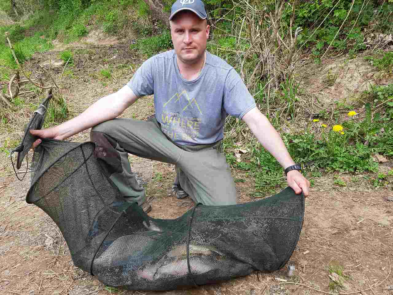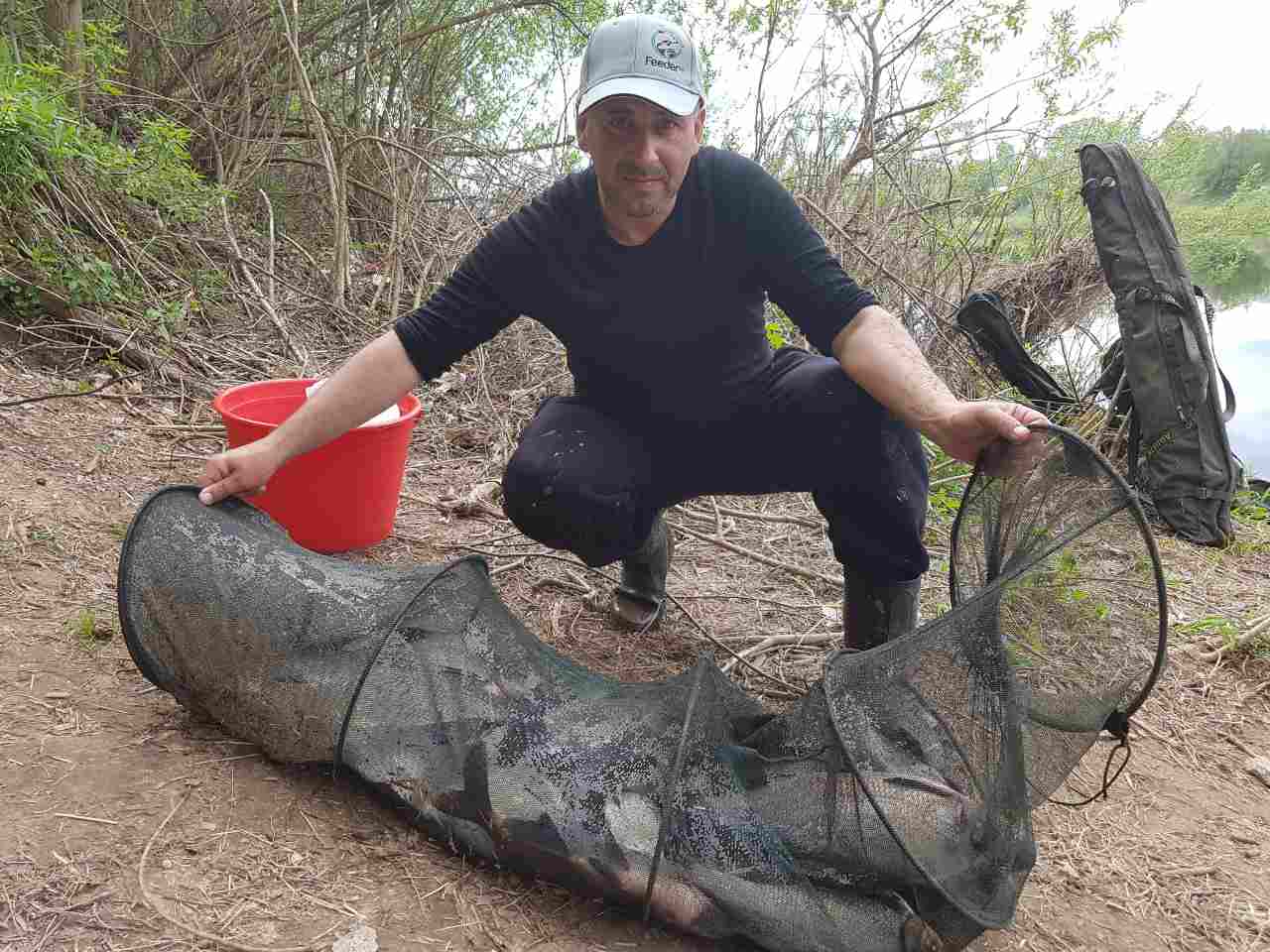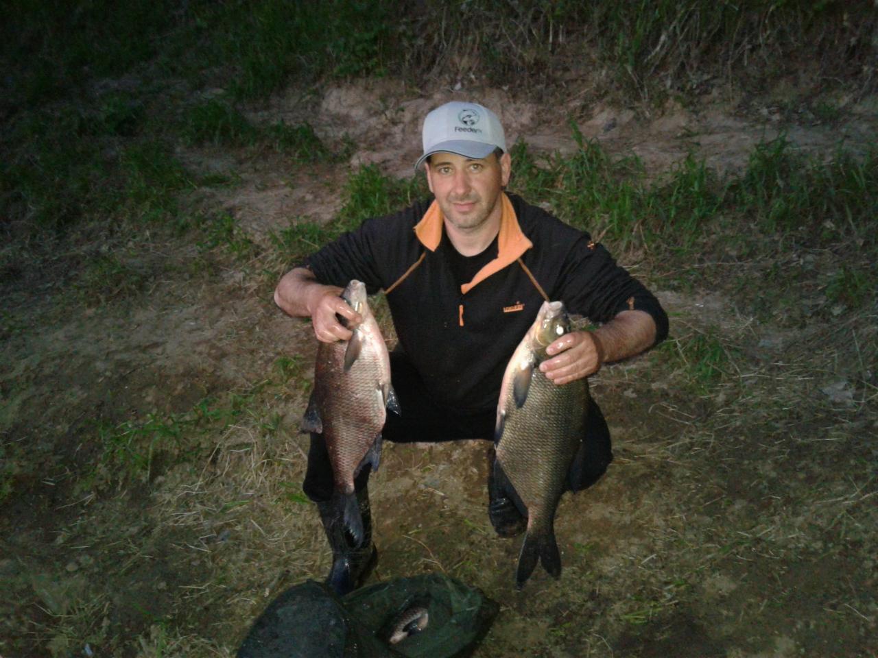 в пятницу вечером с Андрюхой решили еще раз поохотиться за лещем. Выбрали перспективную точку. Отмерили дистанцию ,чтоб создать кормовой стол. Я выше по течению он ниже на 3-5 м . Вечерний выход был с 6 до 8. Размер порадовал. От 1600 до 2200 гр. До 22 ни поклевки. Утром продолжили. Кормить начали в 4. Первый выход в 6 тура. И дальше с переменным успехом до 14-00. ловили в один садок.Ловлю заклнчили. Взяли по три рыбки. Остальных выпустили.