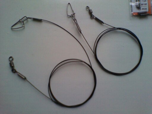 2. Для плетёнки П. Про 0.36 с небольшими воблерами использую корейский поводковый материал, 70-100 см. Продаётся на больших бобинах чёрного цвета, сам поводок тросик из белого металла в чёрной пластиковой оплётке. На разрв крепче, чем П.Про 0.36.