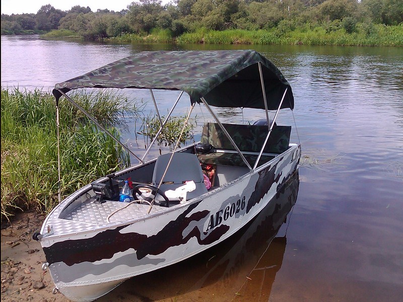 Идея такая: носовая, сужающаяся часть тента отстегивается с помощью молнии, а оставшееся прямоугольное полотно поднимается над лодкой на П-образных стойках, причем к задней оно закреплено постоянно, а к средней и передней крепится только на время его использования тоже при помощи молний(или липучек).
