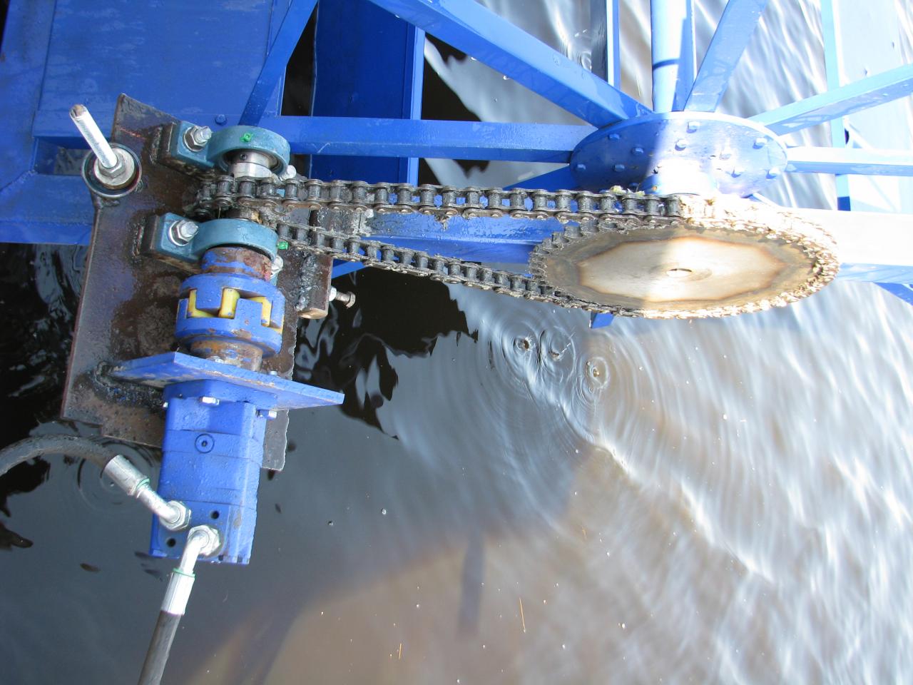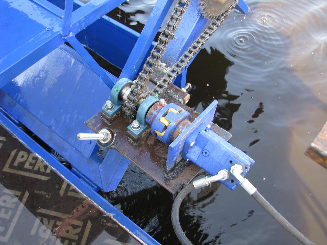 Наконецу-то завершил переделку привода гребных колес. Раньше (это мой просчёт) я поставил гидромоторы прямо на вал гребных колес, уповая на их низкооборотистось. В результате моторы не выходили на достаточно высокие обороты даже для них, дизель давился и не мог продавить через гидромоторы весь поток масла и сильно из-за этого перегревался. Сейчас моторы крутятся намного легче, масло не греется и в результате, посредством редукции (4.5), на гребных колесах появился бешеный упор, даже когда дизель работает на холостых оборотах!