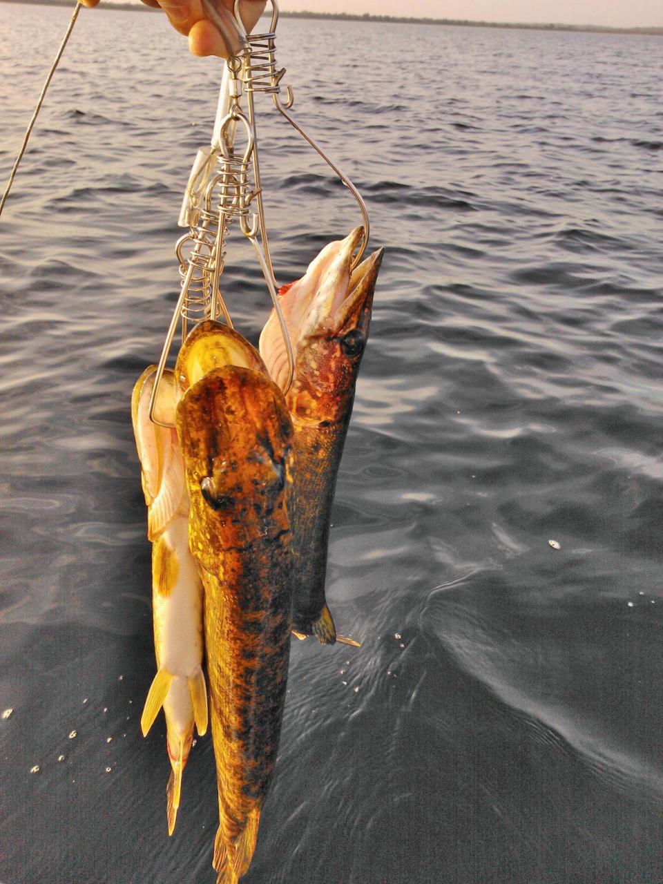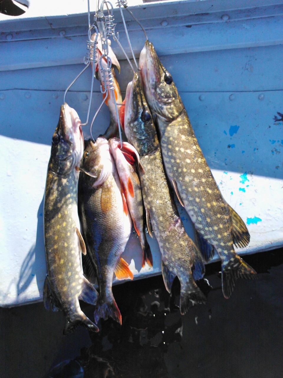 • Не большой отчетик об очередной рыбалке. С клевом на спиннинг была напряженка, даже окунь и тот отказывался попадать на кукан. Радует, что не с пустыми руками. Поймана щучка почти кило, а остальные поменьше. Пять рыбешек весили 2,250.Нажмите на изображение для увеличения.