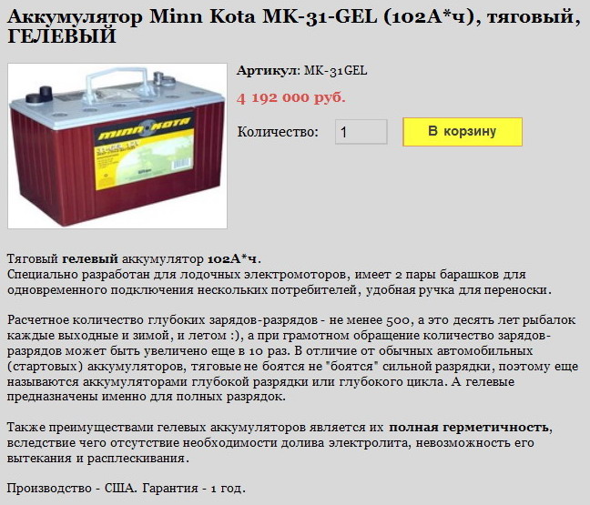 К слову, сказать, Минкота выпускает и гелевые АКБ для лодочных моторов, но каких либо слов по совместимости или несовместимости зарядное + АКБ (гелевая) не встретил.