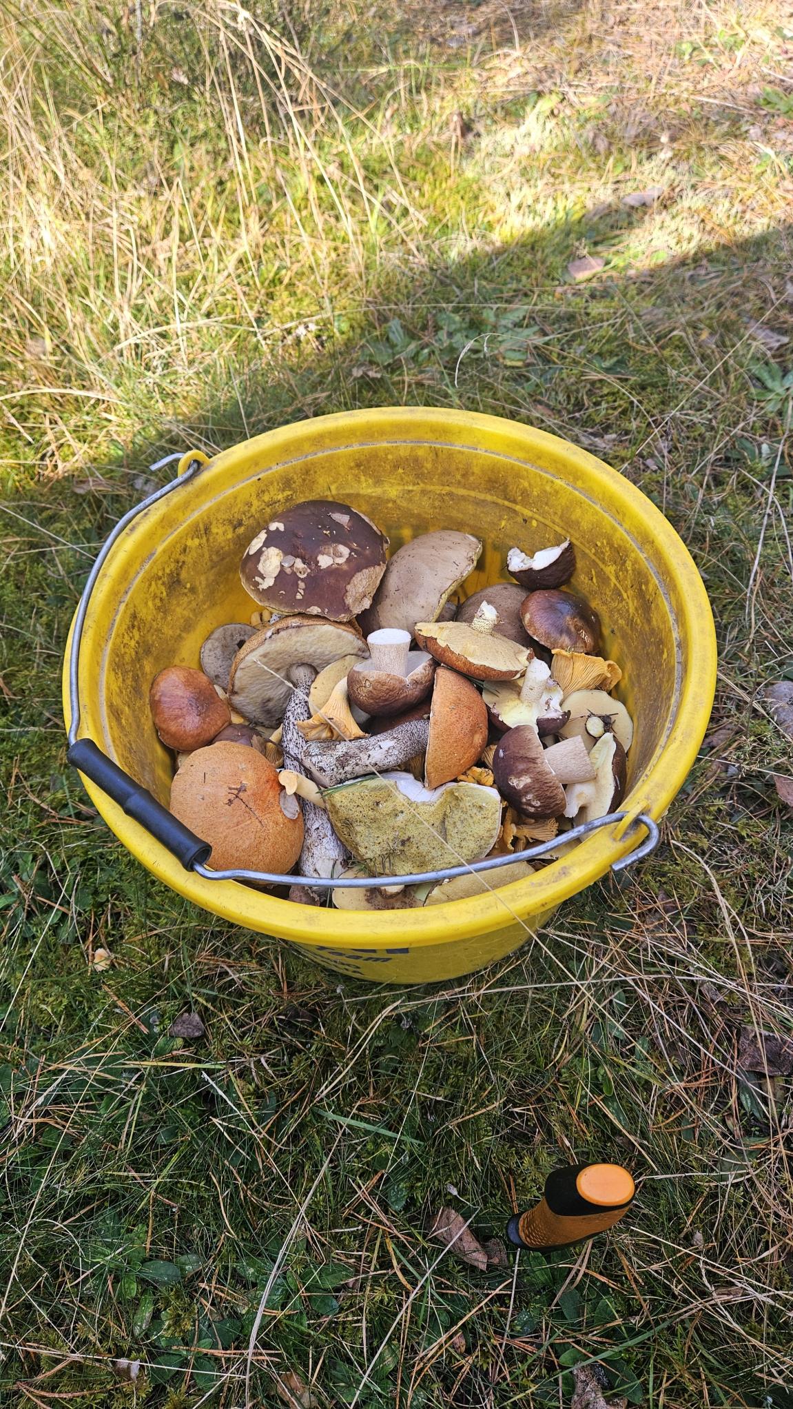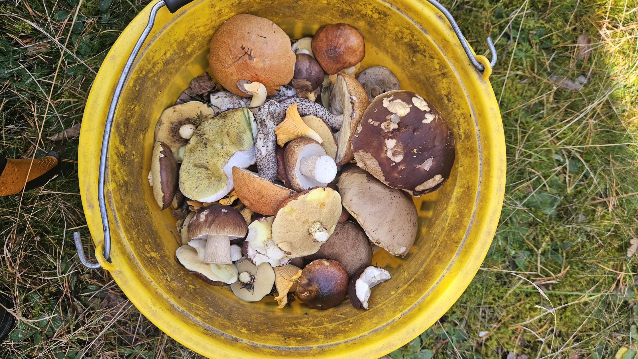 Итог дня - 10 литров хороших осенних грибов, в том числе 15 белых и 4 подосиновика, несколько бабок, лисички, зеленки и треть сбора крепкие осенние маслята.