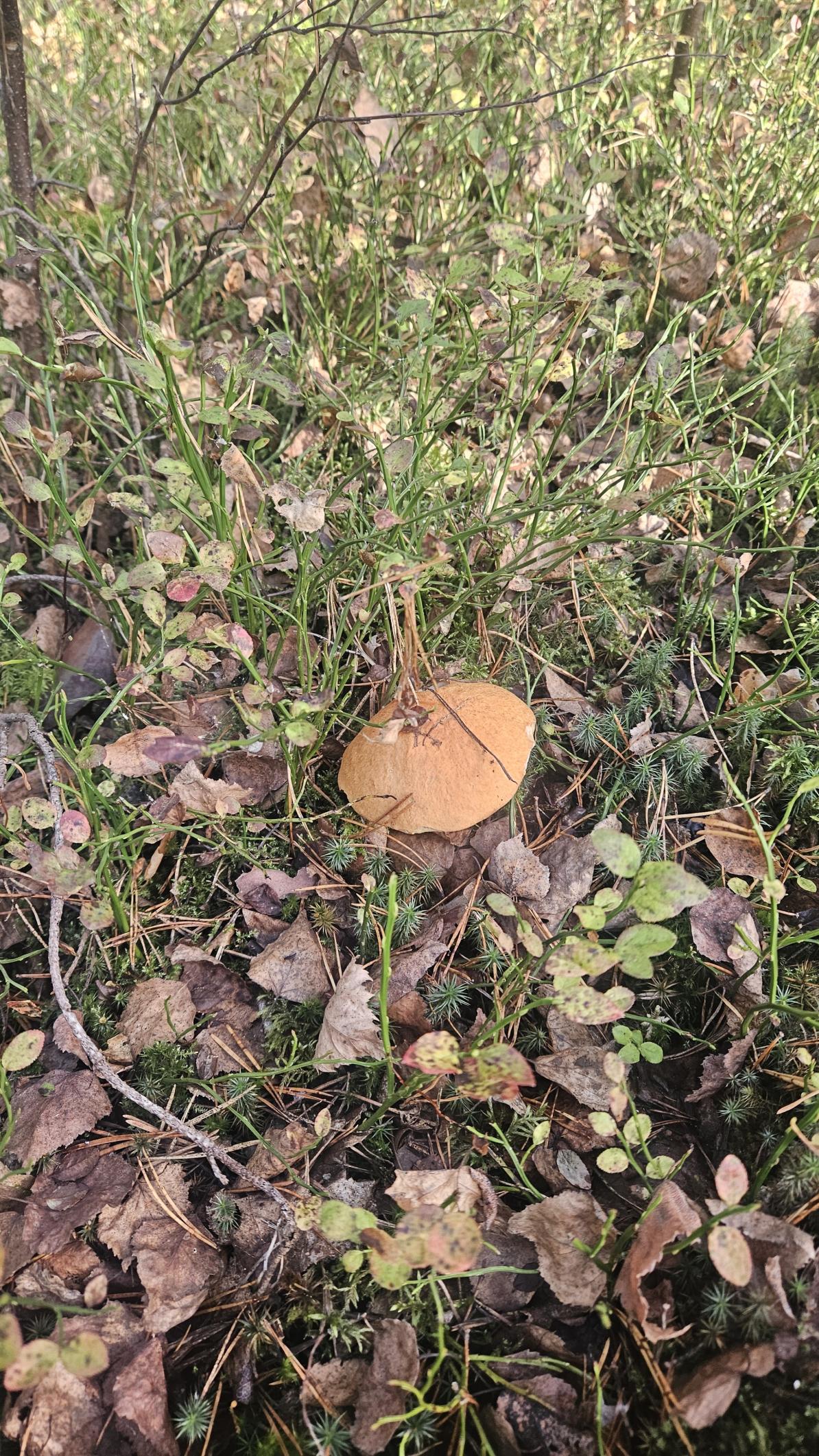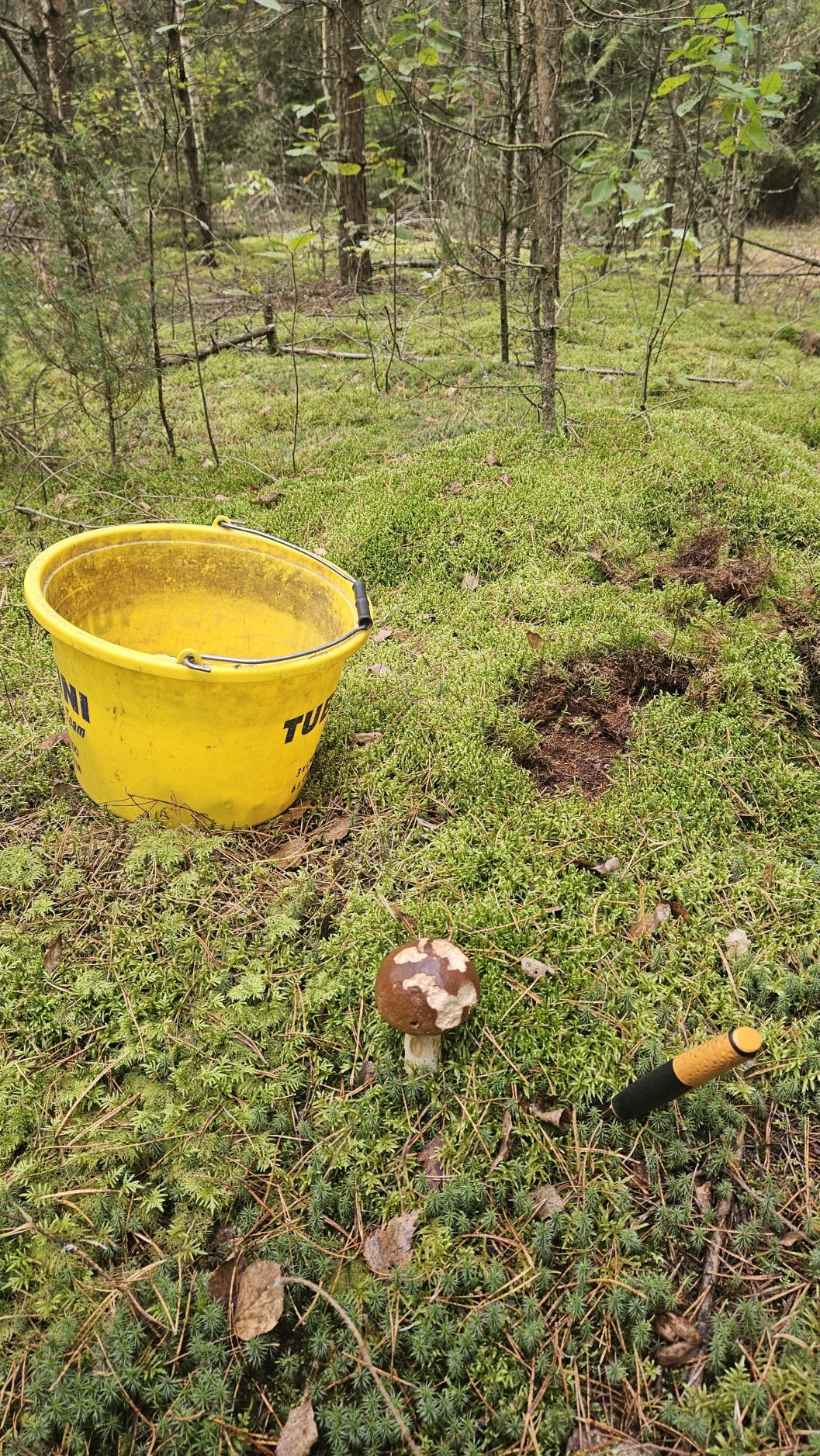Сбор начал в 8 утра и завершил в 9 часов. За это время слегка закрыл дно 12-ти литрового ведра лисичками, и разбавил лисички двумя бабками и одним подосиновиком.