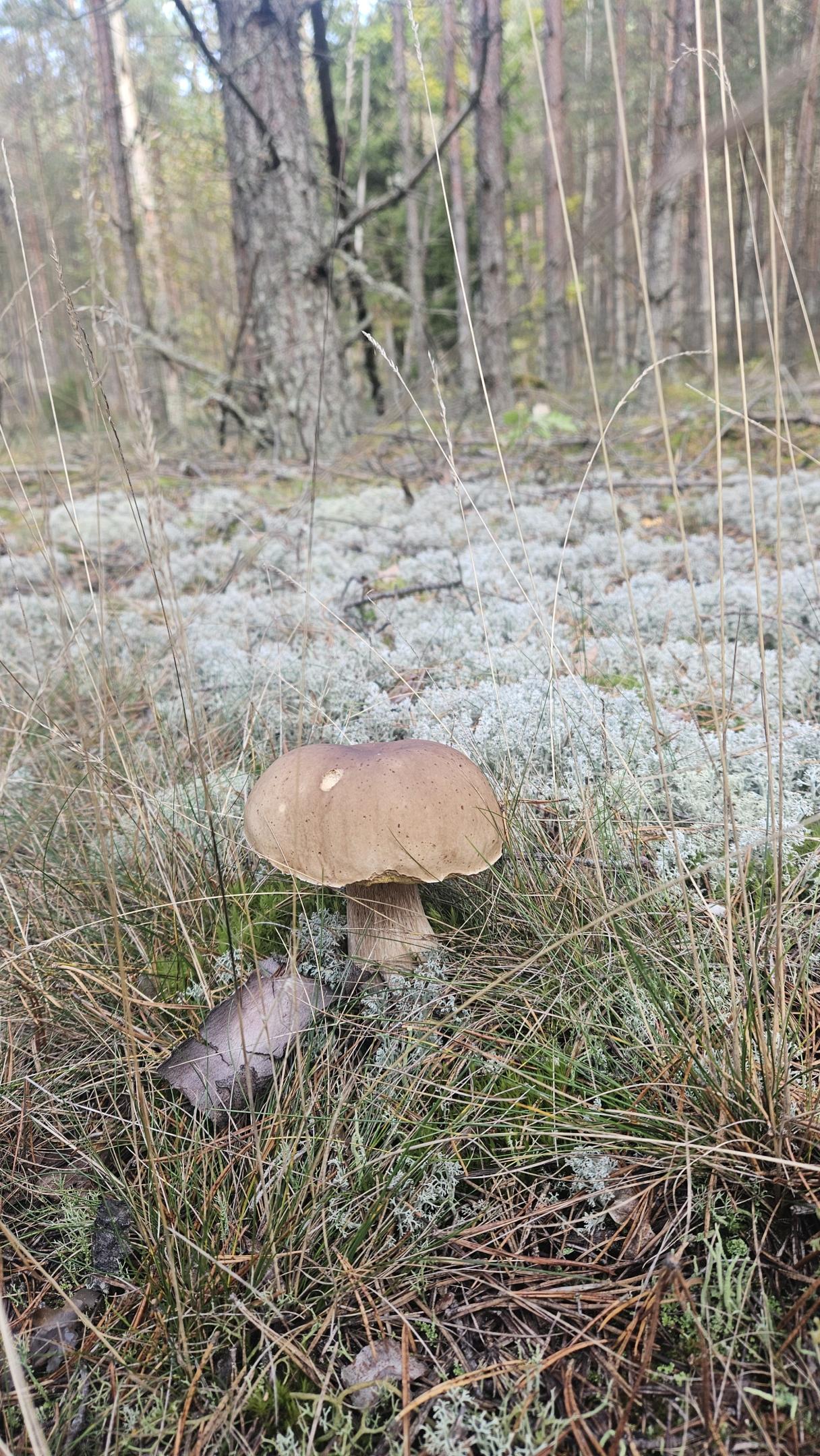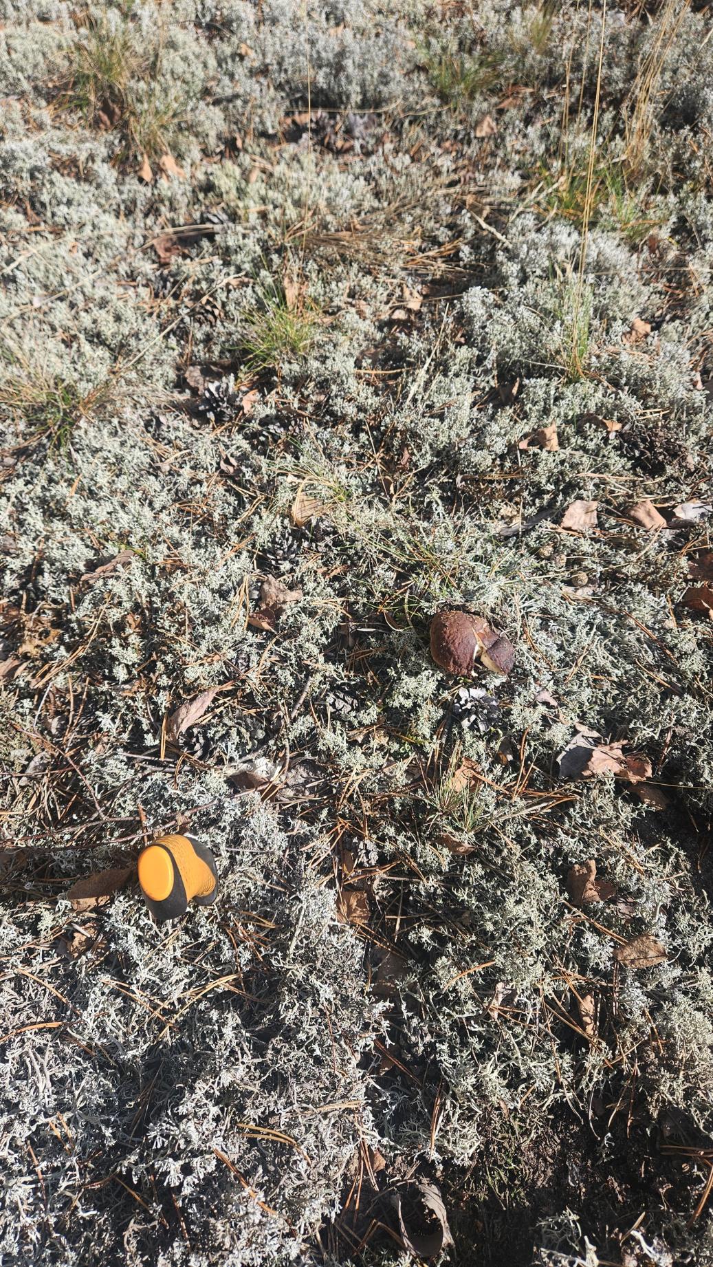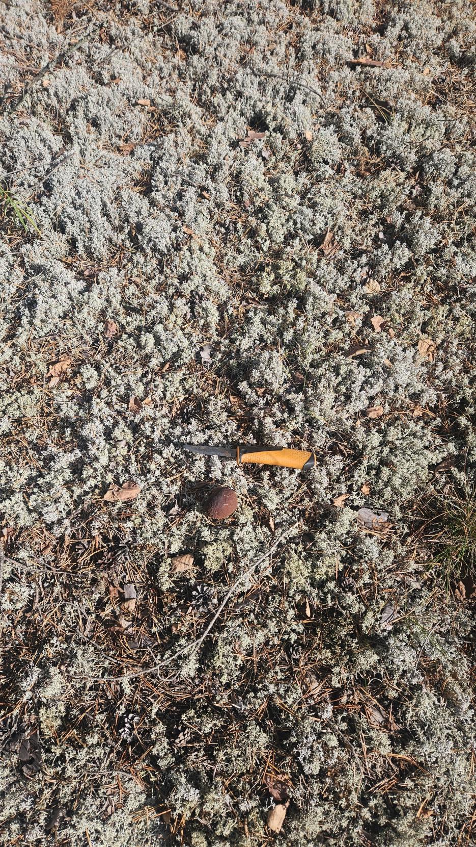 Поехал по дороге. Навстречу ехал местный житель на велосипеде. В ведре у него было не густо. Свернул на боковую дорожку. Поставил машину и пошел по слабо различимой тропе. Метров через 300 тропа привела в интересный лес, сосна среднего возраста и подстилка из белого мха, лес - редкий, хорошо освещен солнцем, ходить очень комфортно и приятно. И грибы есть. Поначалу подрезал маслят. Нашёл еще одну полянку с зелёнками хорошего размера и качества. Потом начали попадаться боровички. По одному сначала, но попалась и семейка из трех молодых и крепких.