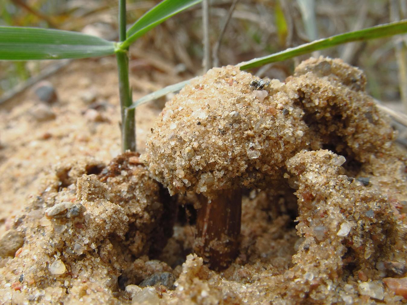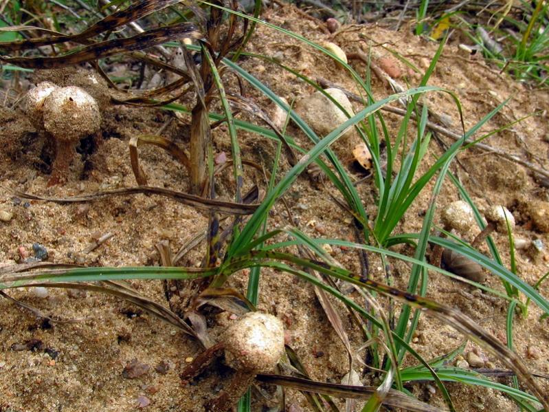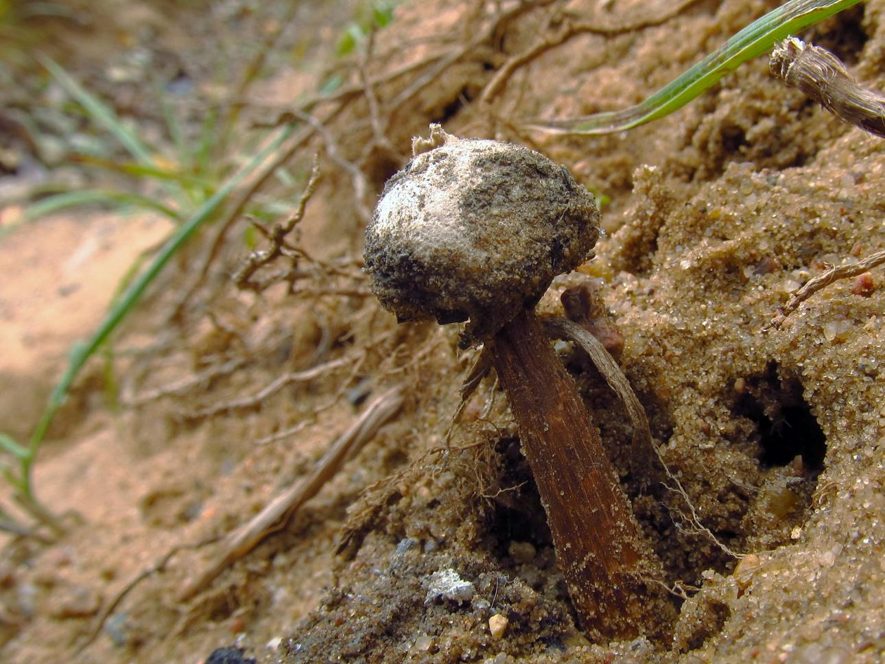 Вот такие, малюсенькие "дождевички- порховки" на длинной ножке. Росли они в песчаном отвале, на берегу реки. А называются- Тулостомы. Видов у этих грибов достаточно много, чётких различий между ними нет, поэтому вид назвать сложно. Но сам факт, что такие грибы есть в Минской области, присутствует.