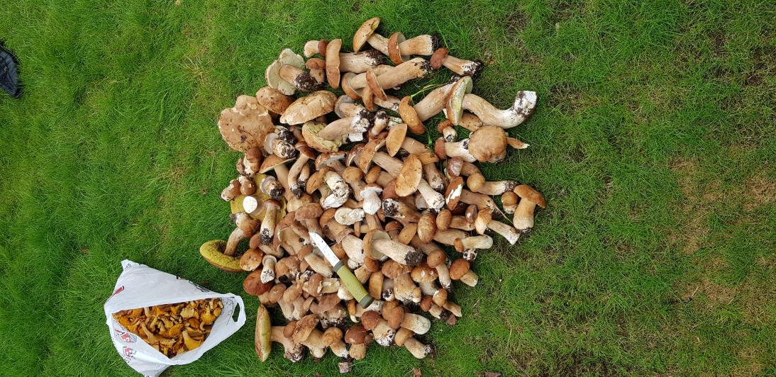Сегодня в районе Домашей. Пяток подосов, пяток бабок, 2 боровика и трохец лисичек. В лесу слишком влажно, все грибы вдоль дорожек, там где посуше.