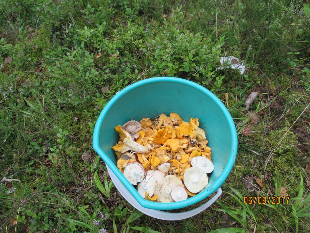 Район Мяделя, сегодня. По дороге покормили дружелюбных щенков. Сбор начали в 6ч закончили в11-30. Народа хватает. В лесу лисички, сыроежки, немного курочек (много червивых), пара подберёзовиков, три маслёнка. Сантиметров 13 не хватило до края ведра. Друзья набрали больше, хотя серьёзных грибов нет. Местами спелая брусника, наелся жменями, даже была мысль собирать ягоду, но победило желание походить. Забрался в болото, переходил через канавы по деревьям , а вдруг за болотцем нехоженые места а там изобилие крупных лисичек. Надежда умирает последней.