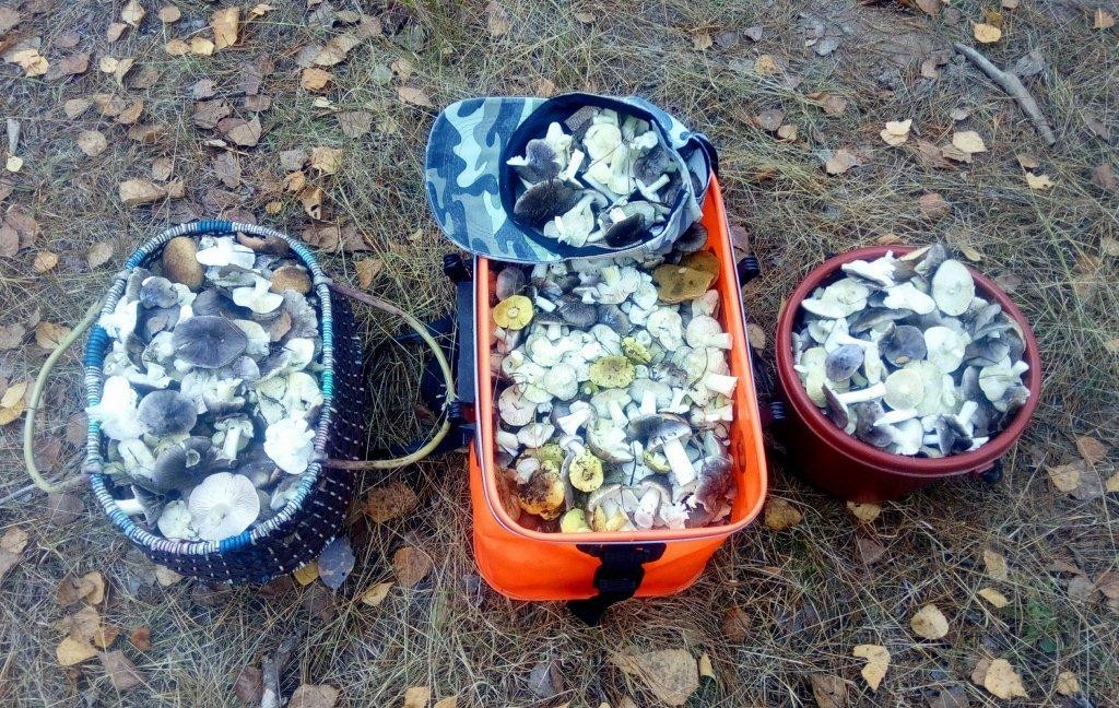 По игогу трёхсполовинойчасовой прогулки (сменили три локации на небольшом расстоянии друг от друга) две трети ведра разногрибицы. Два относительно неплохо сохранившихся крупных белых, хороший подосиновик, немного лисичек и опят, подзелёнки, моховички, пара мокрух. Всего понемногу, но фиолетовой рядовки, да, можно было накосить..