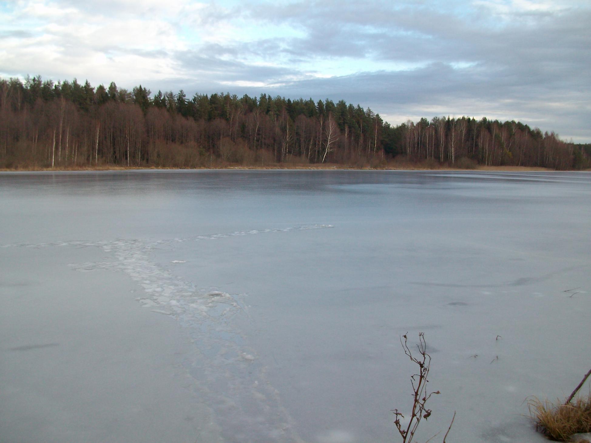Открывал сезон на этих выхах. Лёд- 5 см. На такой тонкий выходил впервой, поэтому кажный шаг простукивал "пешнёй"(прутом чуть длиннее метра). Глубже 1.2 метров не заходил, а это метрах в 6 от берега. В одном из эпизодов решил половить возле трости, засверлился , померял глубину-около 1.8 метра, достал удочку, бочком бочком к берегу :) ни одного рыбака не увидел. тихо и спокойно. посидел над лункой, пдышал воздухом, сделал сотку, скормил мотыля рыбе, увидел несколько поклёвок микроерша и нанококуня, с чувством выполненного долга двинул восвояси. До нормальных морозов решил больше на такой лёд не лезть.Нажмите на изображение для увеличения.