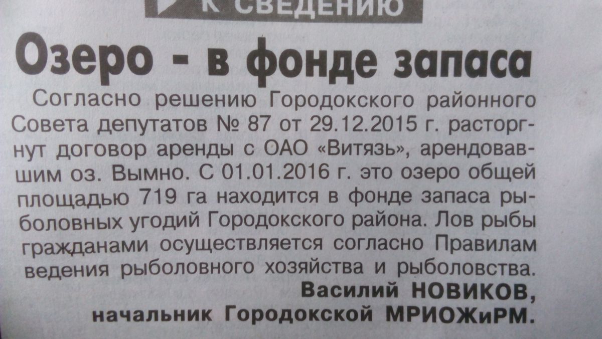 Вымно (бел. Вымна), также известное как Спортивное: 9,15 х 1,35 км, 7,15 км. кв, глубина 7,8 м, 7 островов. Находится в 20 км к востоку от г. Городок на границе с Витебским районом.