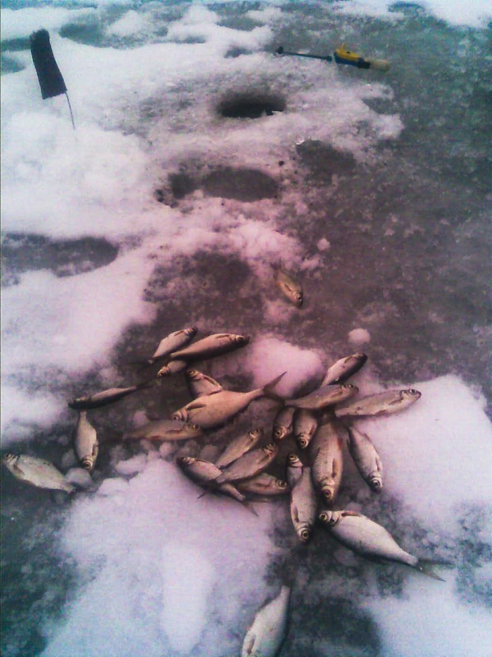 Глубина 4.2 м. Клев начался ровно в 6.30. Просверлил 6 лунок. Прикорм какой-то дешевой прикомкой на основе сухарей с громким названием "ЛЕЩ". Клевало везде, но размер не радовал (подлещик 100-150г., плотва и того меньше). После 12.00 подлещик куда-то сбёг. Зато плотва буйствовала с любого положения и лежа и стоя на игру. Итог кг.4 рыбы и в 15.00 отъезд, заболела рука махать, да и на солнце голова стала деревянная.
