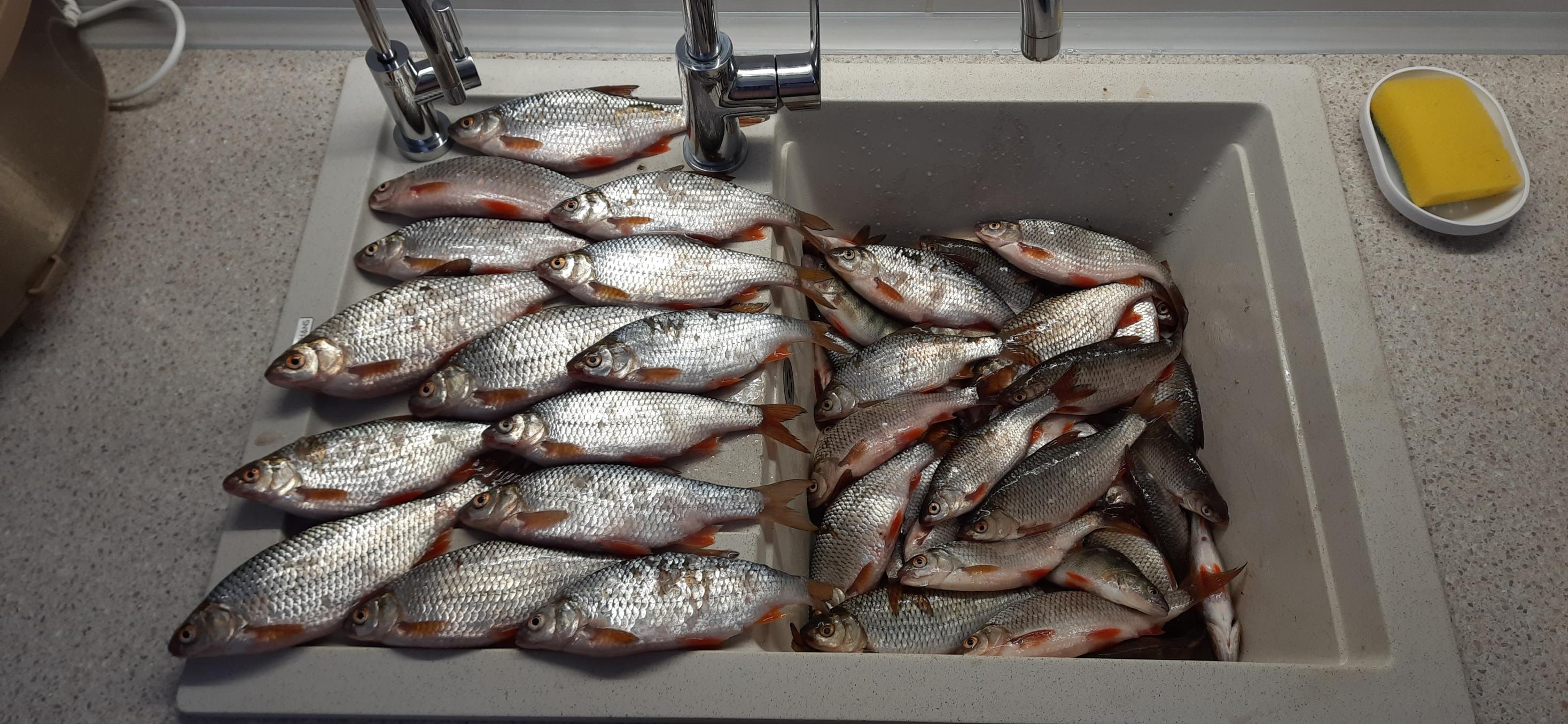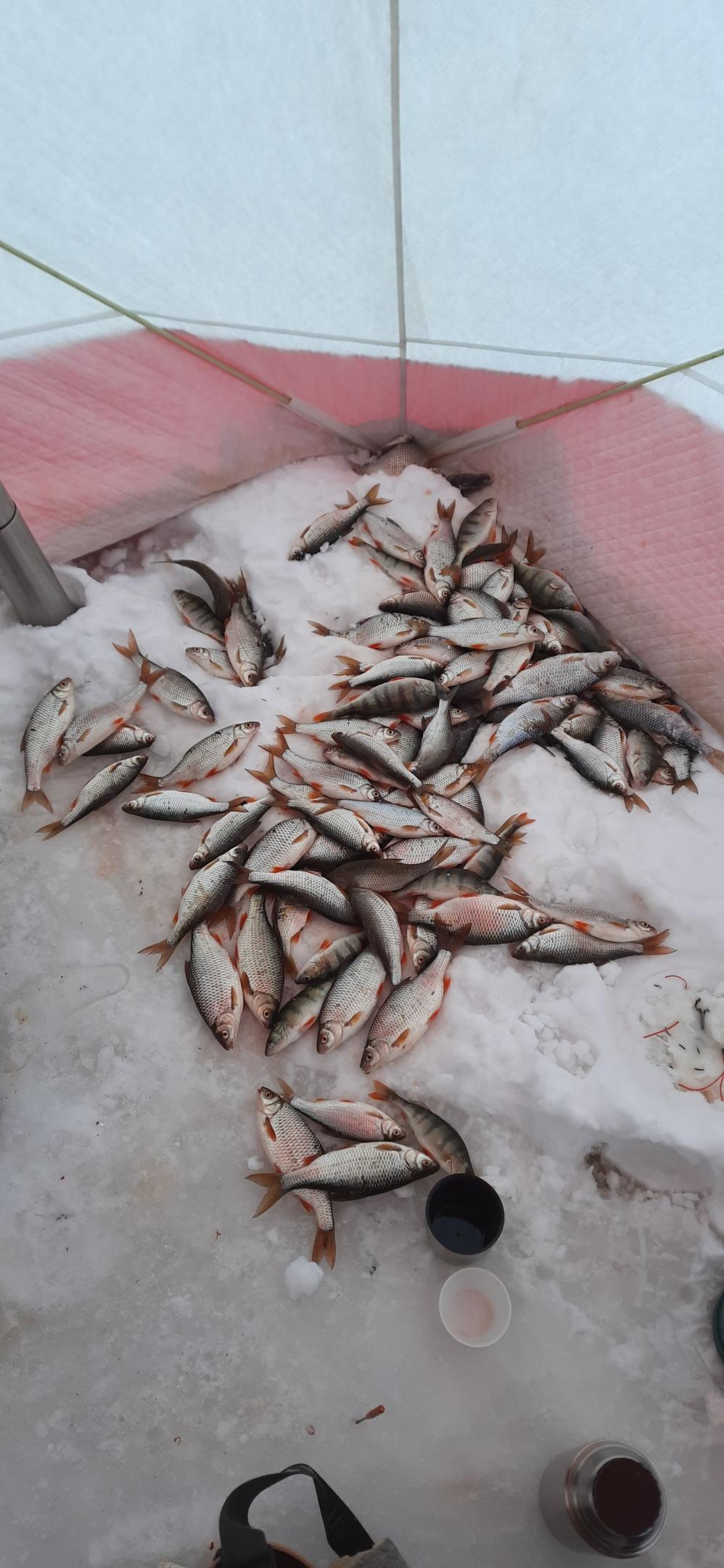 • Следующее воскресенье с другом на том же месте. С прошлой рыбалки осталась половина прикормки, которую освежили 100 гр лимана. Закормили в палатке все 4 лунки и неспешно "позавтракали" по 250 гр в ожидании подхода рыбы на прикормку. В этот раз только на поплавок. Учитывая прошлый раз, пробовали на перловку, а также манку от Nick(а). Эксперимент не принес ожидаемого результата - на них единичные поклевки. Все-таки мотыль вне конкуренции - КЛЕВ ОТЛИЧНЫЙ, и пофик северо-восточный ветер. В этот раз рыбалку закончили еще раньше, а рыбы поймали немного больше. 95 процентов улова плотва, в прилове немного окуня, другу попался 1 подлещик на 540 гр. Вернувшись рано домой, успел почистить рыбу и на жарку, и на засолку. Оказалось, что абсолютно вся плотва сначала объедалась прикормкой, а на "десерт" хватала нашего мотыля. Кстати, я и не припомню такого, чтобы 1 кг прикормки + 300 гр лимана хватило на две рыбалки на двоих, а общий улов при этом составил более 20 кг. При этом "мелочь" по 70-80 гр мы отпускали, если она не брала в заглот и легко снималась с крючка. Утром мы вкинули в лунки по одной полной кормушке, в обед по половине, раскрывали их в 30-40 см от дна. Мне показалось, что кормить лунки лучше чаще, но небольшими порциями. Поэтому в следующий раз с утра попробуем по половине кормушки, а не по целой. Может плотва быстрее начнет отзываться на мотыля. Посмотрим.