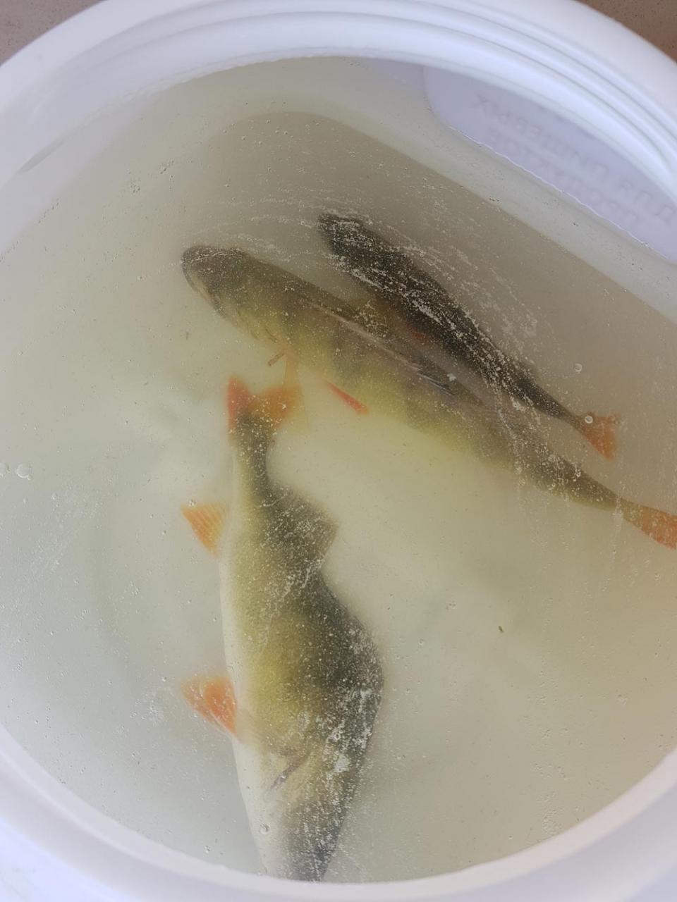 Один карасик порезанный явно щуков и штук пять "обсосаны" видимо окунем - 9 карасиков померли за ночь, хотя цеплял через жабру на двойник. По итогу 1 окушок с 2.5метрах - 340гр, судя по переваренной части живца, сел еще вечером.