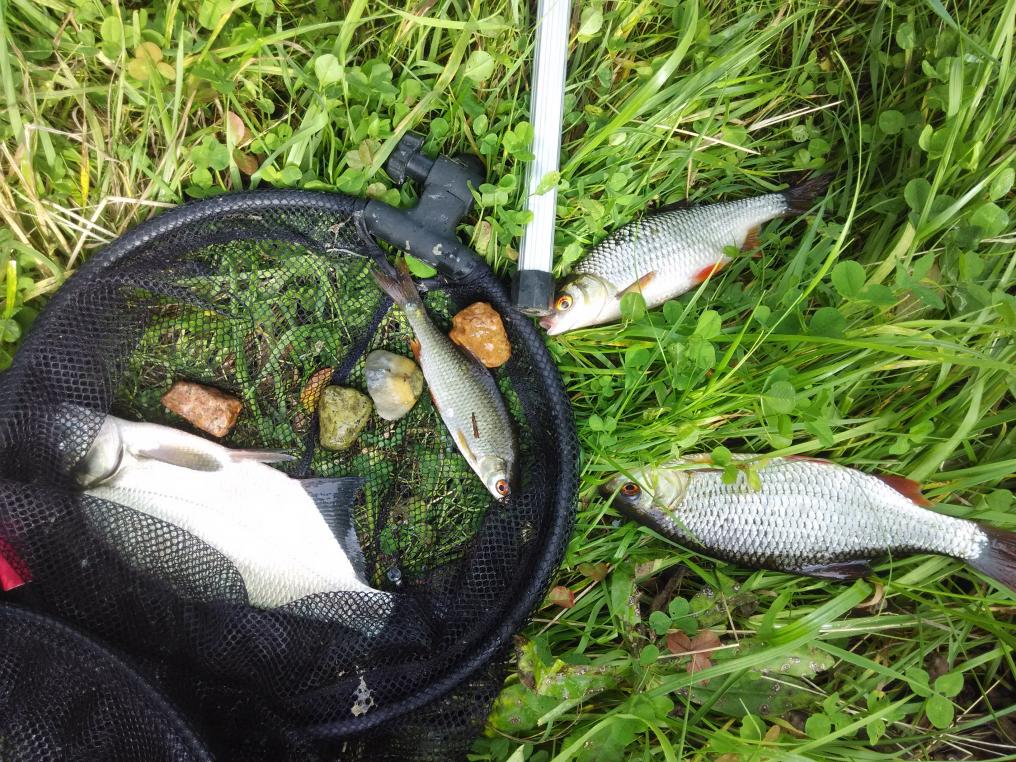 • В субботу прибыл где-то в 6, место моё не занято, радуюсь. пол часа на оборудование места и приступил к рыбалке! Радовал ветер, т.к. не давал волну. Просидел я до часа и выловил только 1 подлещика, 3 плотвы (фото) и то, были пойманы при дальних забросах на падение, т.е. залетные.