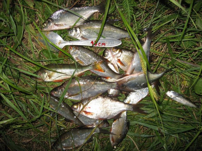 Отец ловил на фидер - днём безрезультатно, если не считать двух водолазов. :-) Я ловил на спиннинг. Эхолотом видел глубины до 8 метров. Вечером - почти ноль. На резину полное молчание, на колебалку тоже. Мелкие номера вертушек тоже не ловили.