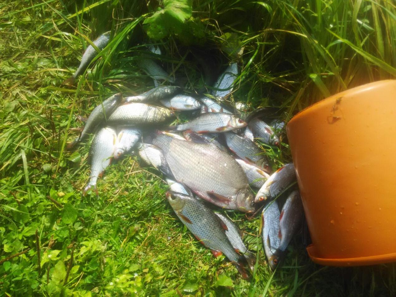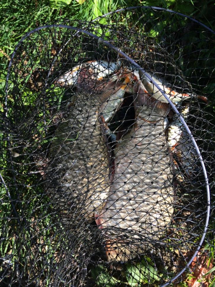 В воскресенье уже было больше времени, с ранья и до 14:00. Рыбаками был облеплен весь берег со стороны, так сказать, пляжа. С собой из наживок червь, опарыш, макароны, кукуруза. Прикормка покупная разнокалиберная, но уже какой раз меня расстраивает RS лещ с красными штуками внутри, больше его покупать не буду, у прикормки какой-то обратный эффект, может совпадение! В руки матч на дальний запрос и у берега мах 6м. Клев непонятный, большой пик пришел где-то после 12. Попались 2 хорошие плотвы, видно на фото. Опять был выловлен карпик на грамм 100 и отпущен, остальную рыбу забрал на засолку.