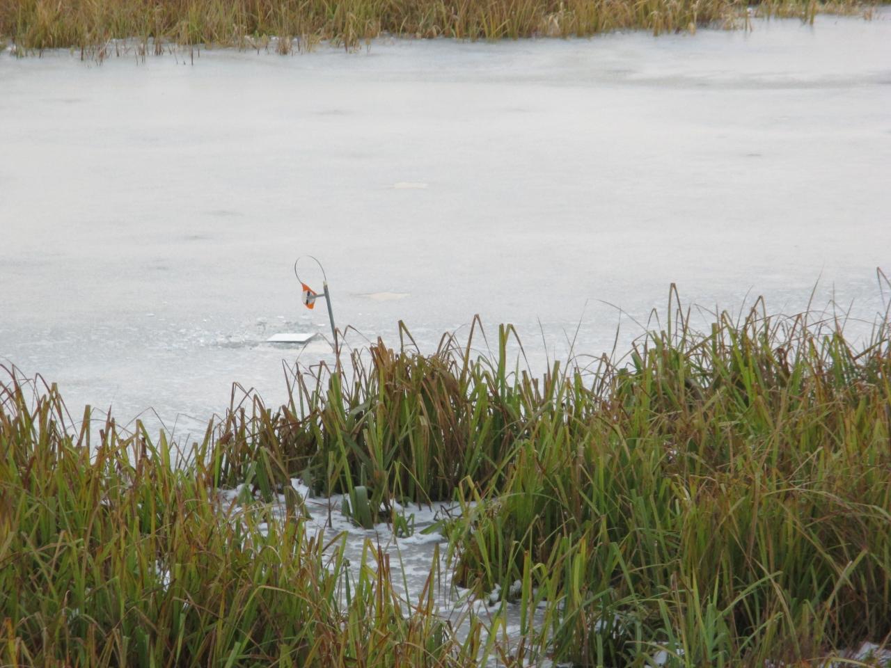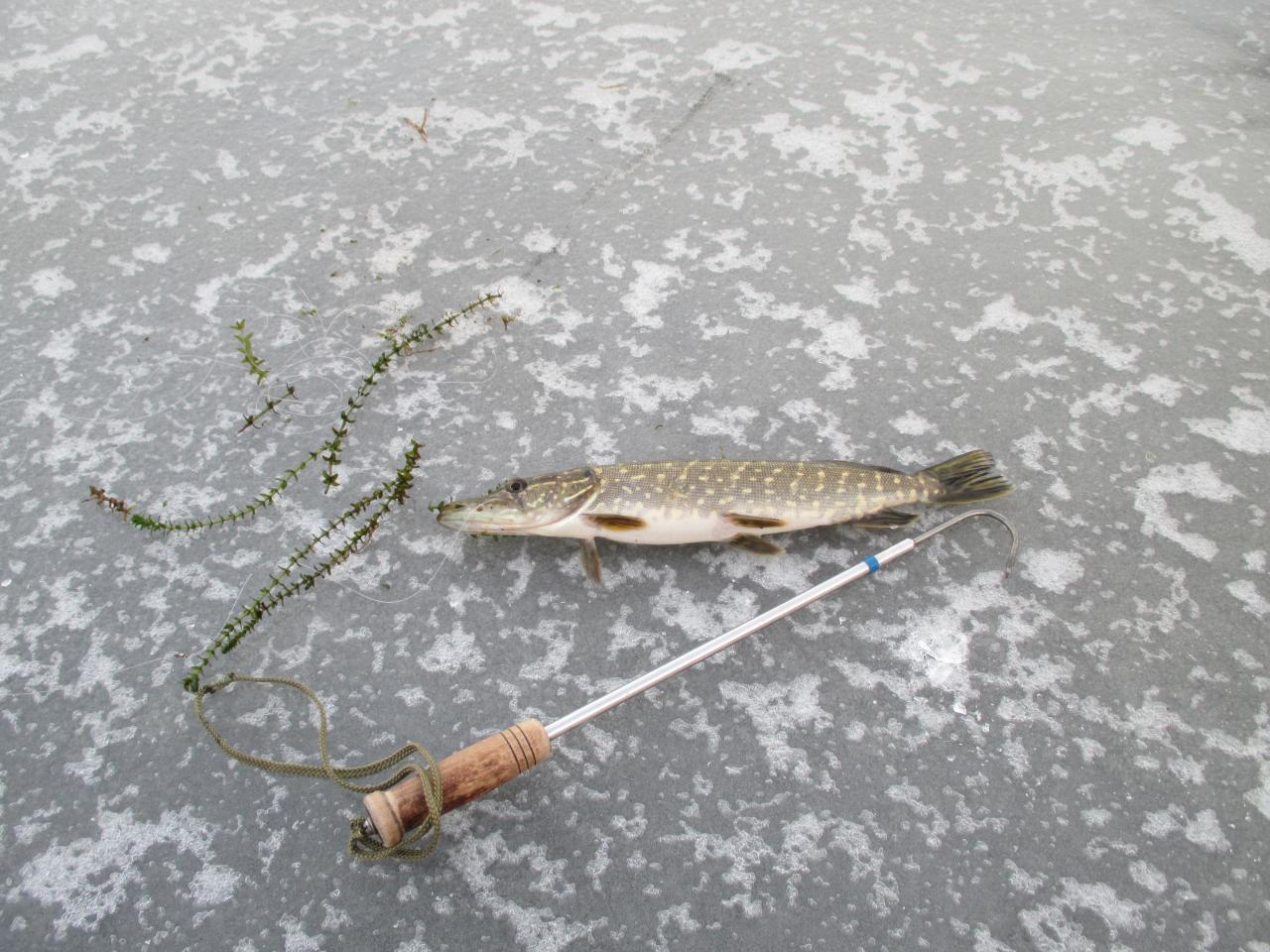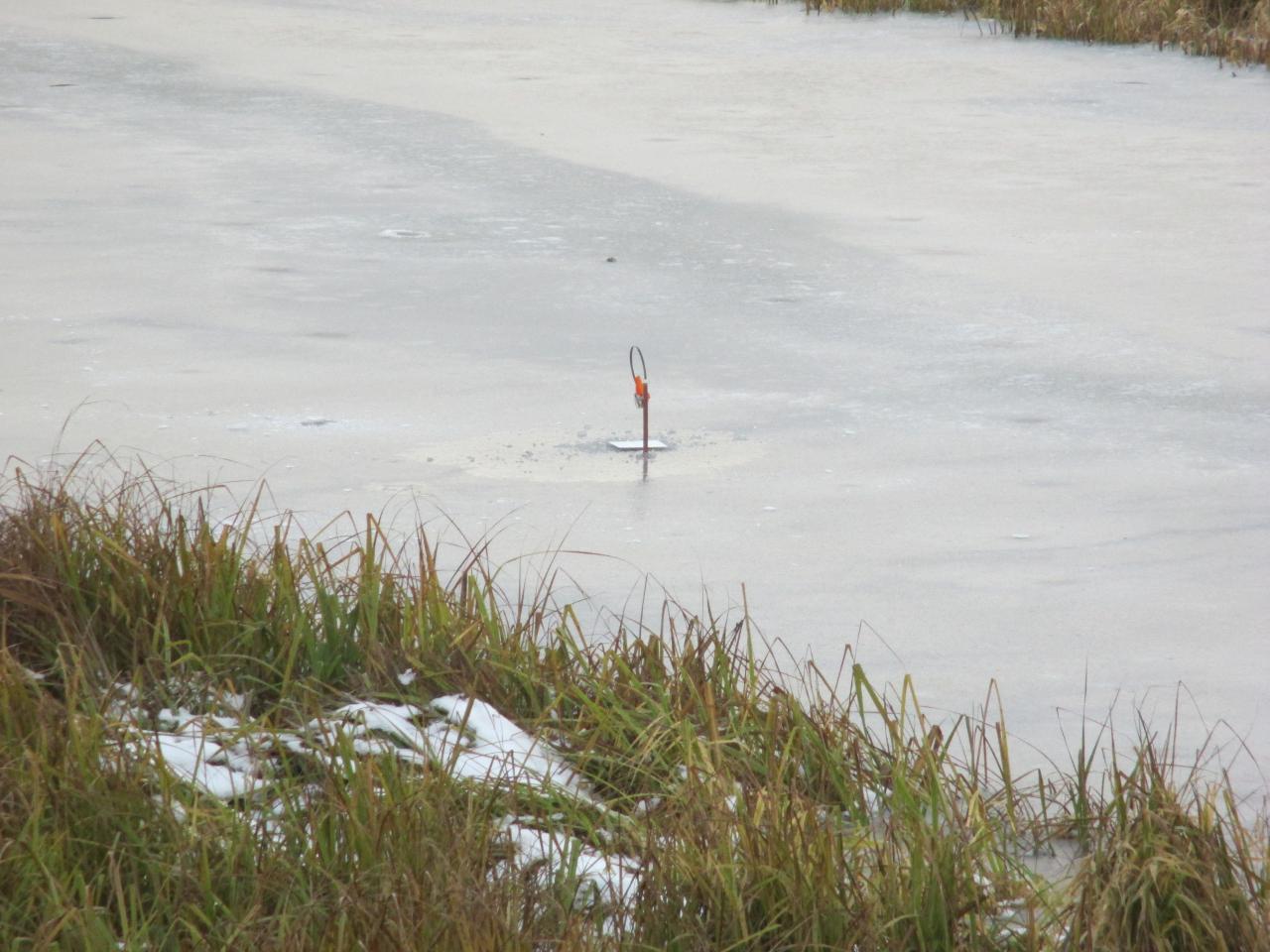 Почему начал с этого вступления? Сегодня я открыл сезон ставочной ловли. Ловлю щуку зимой исключительно на 10ст.,поэтому по классификации отдельных пользователей я »голодный«. Собрался ещё в воскресенье. Искал напарника, но желающих из своих друзей не нашёл, да и уговаривать на первый лёд считаю нельзя. Каждый должен сам созреть. Главное по перволёдку для меня безопасность. Поэтому пешня, верёвка, спасалки, костюм с положительной плавучестью и место которое позволит самостоятельно выбраться в непредвиденной ситуации.Ради интереса взвесился дома в костюме 90кг. Итак я один (это не правильно), канал , глубина 2м. Прибыв на место , простучал лёд, нашёл места выхода (вдоль всех ставок 4-5 чистых полосок без травы, трава это сейчас слабое место ). Лёд сухой 5см, из них 1,5-2см белый. С утра не трещал, с обеда начал потрескивать, появились лужи. Выставил 10ст. на пескаря средних размеров 8-9см. В 9ч всё уже стояло и через 15 мин первая вспышка (даже чая не успел попить). Не спеша подкрался к ставке и замер в ожидании, пошла , подсечка, есть . Не спешу поводок флюрокарбон. И вот первая красавица на льду, обмер 35см., гуляй. Я на «седьмом небе», лёд держит, поклёвку видел , щучку достал и заметьте это в самом начале. Значит, рыба есть и клюёт, так думал я, но не она. Это была единственная поднятая щучка за весь день. Было ещё две сработки, когда замирало сердце, но они были окунёвые и пустые. Чтобы не искушать судьбу, старался барражировать по берегу. Сверху все ставки как на ладони. Погода прелесть, правда, думаю не для щуки, почти целый день солнце. Пяток ставок переставлял. Позже появились ещё рыбачки, окунятники, но тоже плохо. Закончил рыбалку в 14-40, в отличном настроении, день удался, канал проверил, сезон открыл. В 18ч был дома. Скорей всего на лёд выйду после следующих морозов.