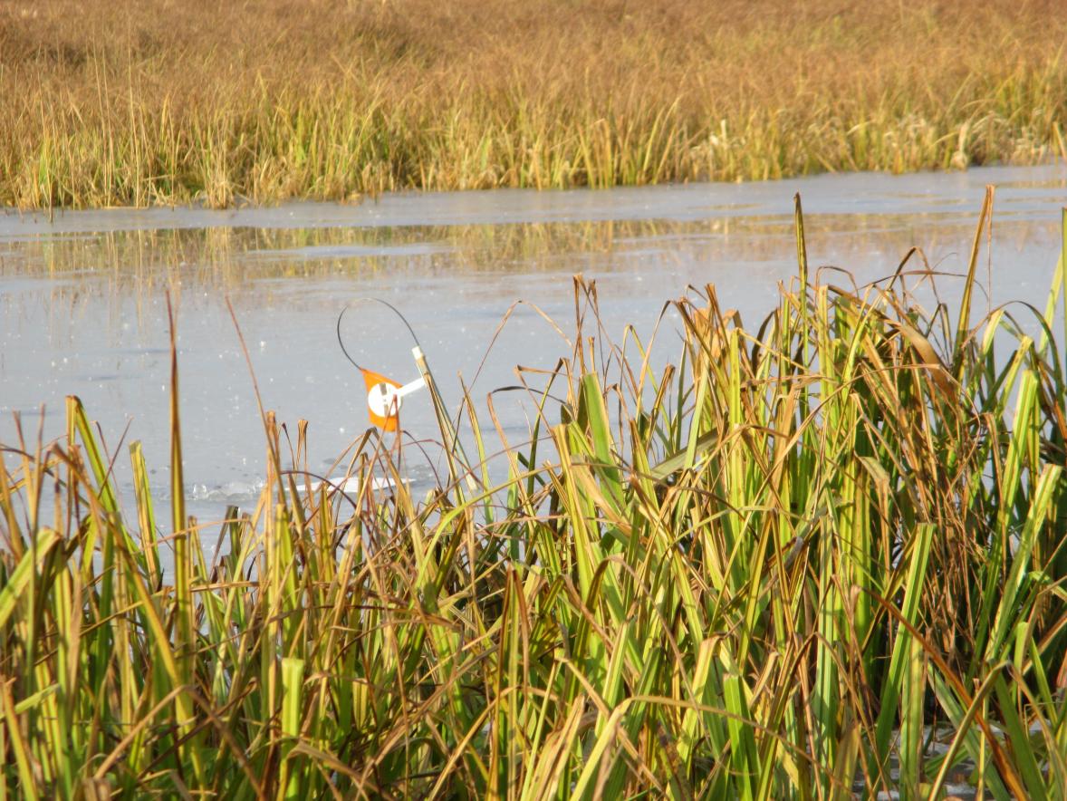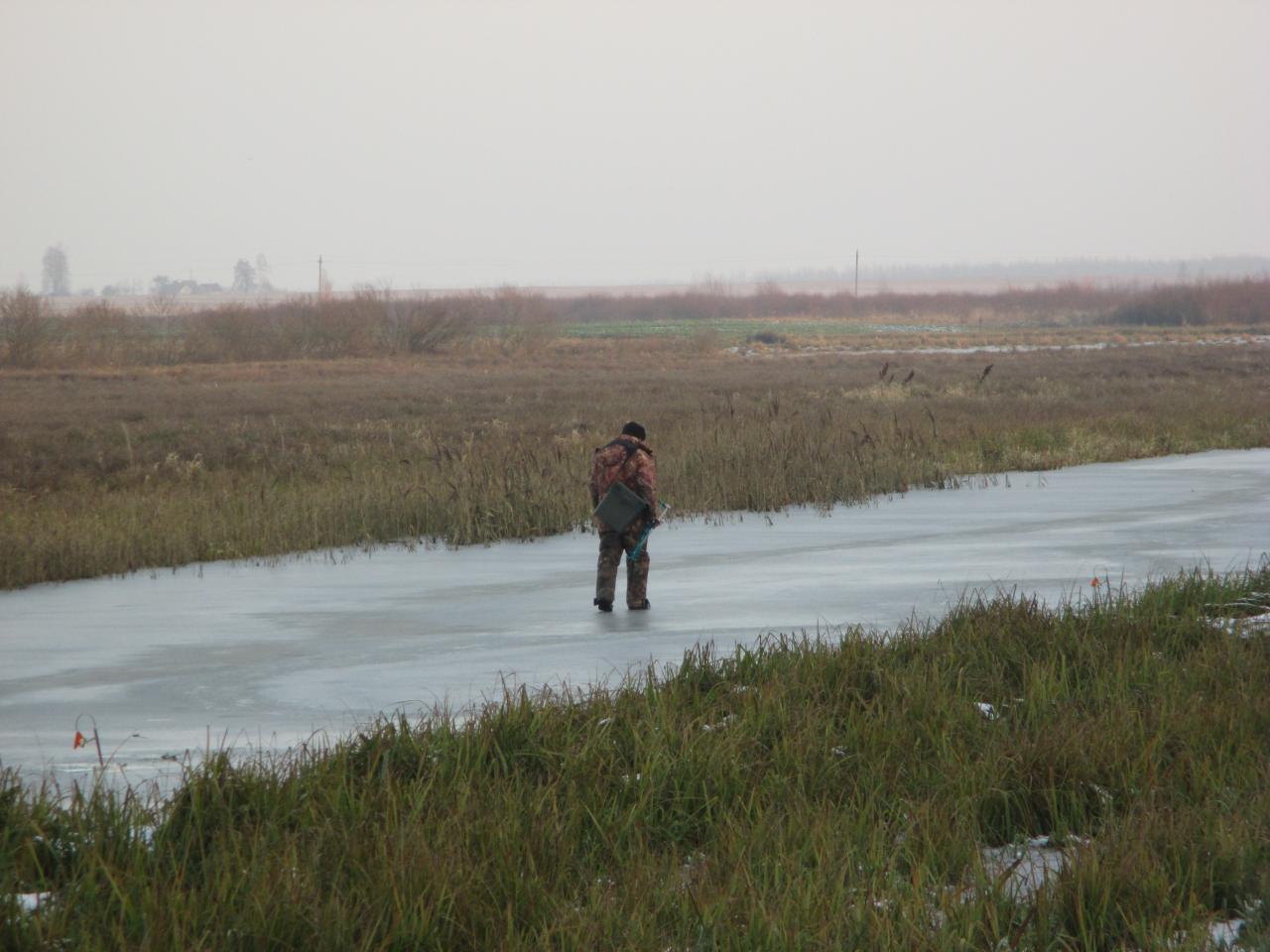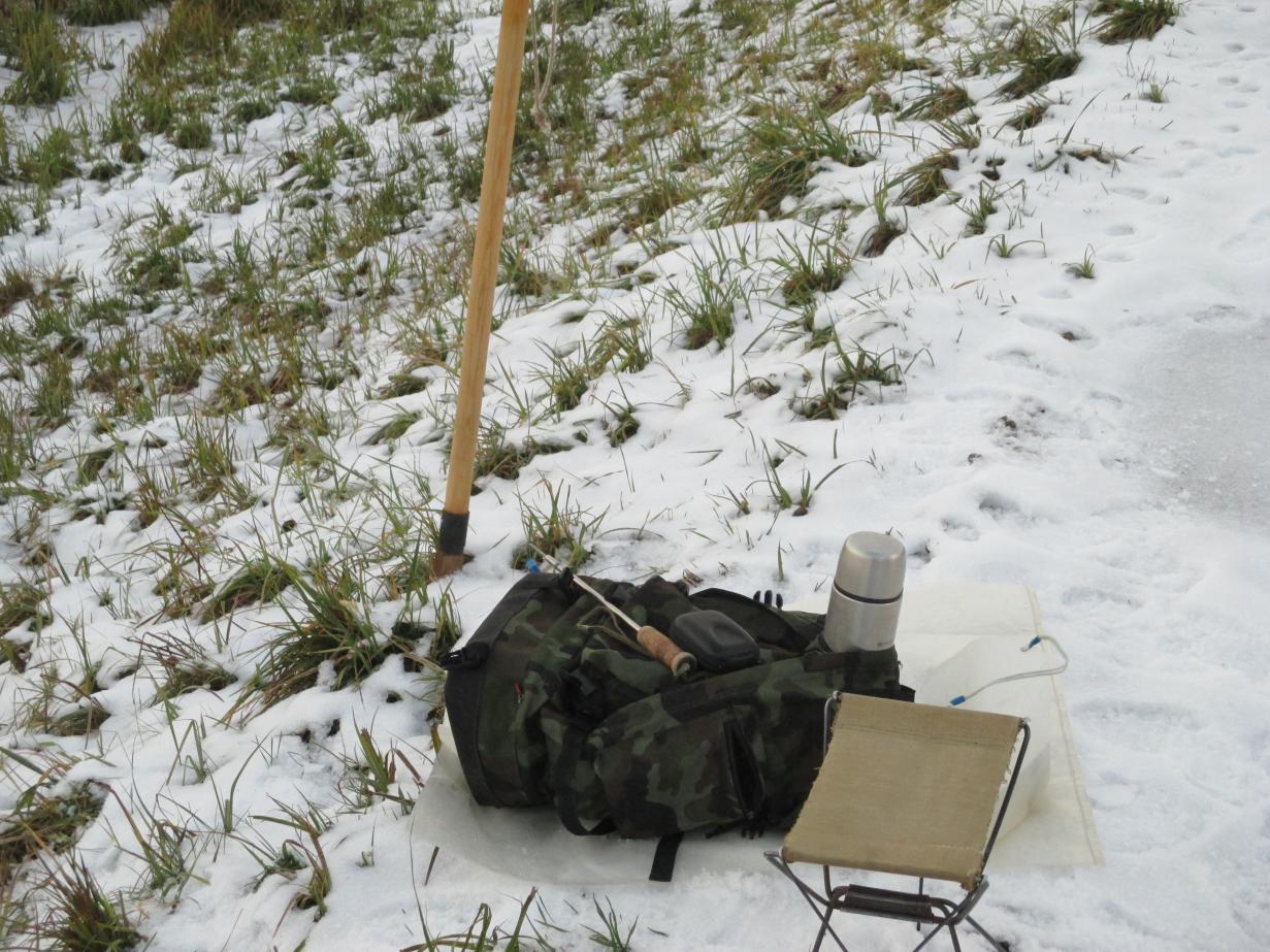 Почему начал с этого вступления? Сегодня я открыл сезон ставочной ловли. Ловлю щуку зимой исключительно на 10ст.,поэтому по классификации отдельных пользователей я »голодный«. Собрался ещё в воскресенье. Искал напарника, но желающих из своих друзей не нашёл, да и уговаривать на первый лёд считаю нельзя. Каждый должен сам созреть. Главное по перволёдку для меня безопасность. Поэтому пешня, верёвка, спасалки, костюм с положительной плавучестью и место которое позволит самостоятельно выбраться в непредвиденной ситуации.Ради интереса взвесился дома в костюме 90кг. Итак я один (это не правильно), канал , глубина 2м. Прибыв на место , простучал лёд, нашёл места выхода (вдоль всех ставок 4-5 чистых полосок без травы, трава это сейчас слабое место ). Лёд сухой 5см, из них 1,5-2см белый. С утра не трещал, с обеда начал потрескивать, появились лужи. Выставил 10ст. на пескаря средних размеров 8-9см. В 9ч всё уже стояло и через 15 мин первая вспышка (даже чая не успел попить). Не спеша подкрался к ставке и замер в ожидании, пошла , подсечка, есть . Не спешу поводок флюрокарбон. И вот первая красавица на льду, обмер 35см., гуляй. Я на «седьмом небе», лёд держит, поклёвку видел , щучку достал и заметьте это в самом начале. Значит, рыба есть и клюёт, так думал я, но не она. Это была единственная поднятая щучка за весь день. Было ещё две сработки, когда замирало сердце, но они были окунёвые и пустые. Чтобы не искушать судьбу, старался барражировать по берегу. Сверху все ставки как на ладони. Погода прелесть, правда, думаю не для щуки, почти целый день солнце. Пяток ставок переставлял. Позже появились ещё рыбачки, окунятники, но тоже плохо. Закончил рыбалку в 14-40, в отличном настроении, день удался, канал проверил, сезон открыл. В 18ч был дома. Скорей всего на лёд выйду после следующих морозов.