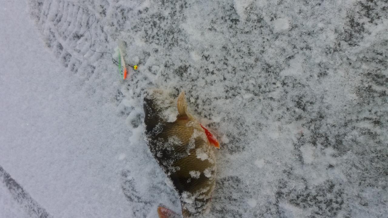 Побалансирил в первой половине дня...Упирался с рассвета в щучий, мебару цвета хаки..Не брала..В часов 12 повесил окуневый кислотник и на второй же лунке сход в лунке приличной щуки..На четвертой лунке мордастый полосатый красавец уверенно атаковал..Через минут 20 ещё один..