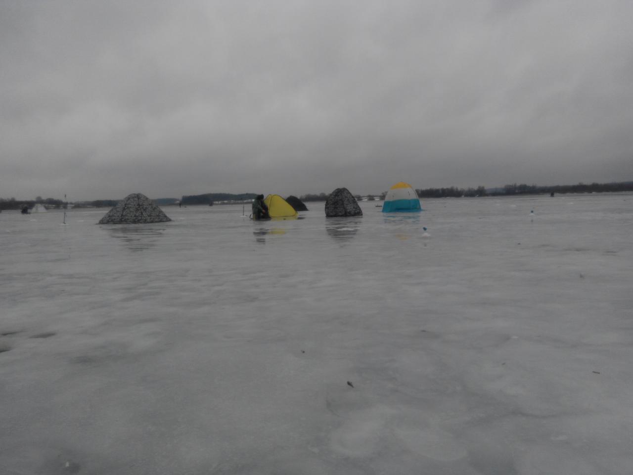 Удалось и мне сегодня половить на любимом водоеме в районе Юности. В 6-45 уже выгружался на стоянке. Потом марш-бросок по снежной каше до места ловли, правда вода на льду была где-то пол дороги, потом сухой лед. Пока рассверлил 8 лунок, плюс две лунки для палатки, пошел неслабый такой дождик и усилился ветер. Пока поставил палатку и закормил лунки - конкретно вымок, хоть был в плаще. Когда рассвело, увидел рядом вот такой палаточный городок. Через некоторое время ко мне присоединился брат. Забросили удочки в палатке и стали ждать. Около 9 ти у меня первая поклевка, и плотка грамм на 80 затрепыхалась на льду. Потом до 10 ти полная тишина, даже шевелений не было. К 10ти закончился дождь - вышли пройтись по лункам. Потихоньку рыбка начала кушать макарошки. До 12-30 самый активный клев. Потом поклевки были все реже и реже. Дождь и ветер периодически загоняли нас в палатку, где как обычно клет не очень. Ветер был такой, что пришлось снять с лески поплавок и ловить только на кивок. К 17-15 стали собираться домой. Итог вот такой