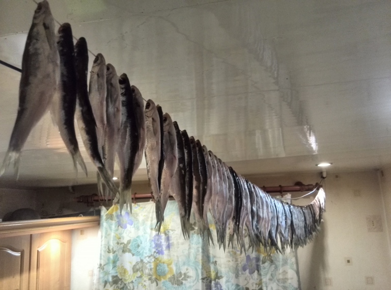 • Вот первую партию только повесил вялится. И где же она мелкая? Крупнее только жерехи. Так, на глазок, в выварке кг 10-12 осталось.