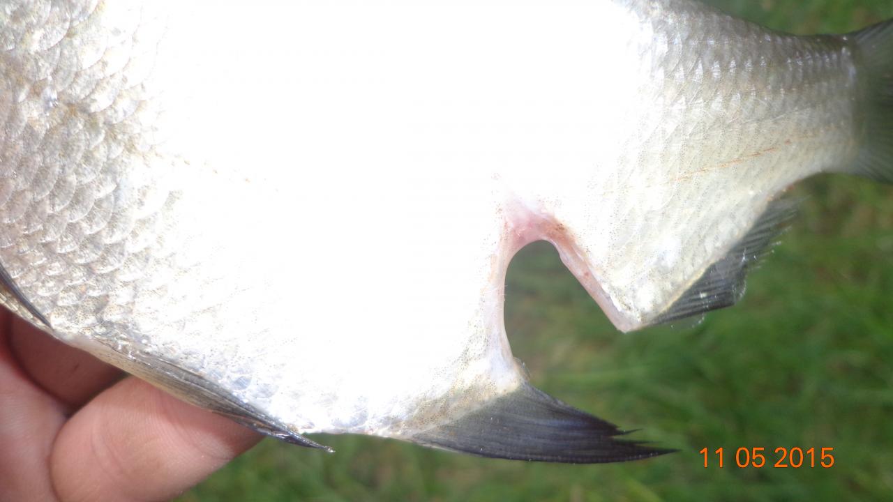 Сегодня снова побывал на ММ.Ловил как обычно на кормушку,но сегодня кормил Трапером. Клевало редко и с каждой поклёвкой размерчик все меньше и меньше.Рыбку весом в 120 гр. и 80 гр. отправил подрастать.А подлещики 440 гр.,420 гр.,410 гр.,320 гр. и плотвичка 110 гр. в 14-15 поехали со мной домой....Есть вопрос к знающим рыбакам:-От чего могут быть такие последствия у рыбы?