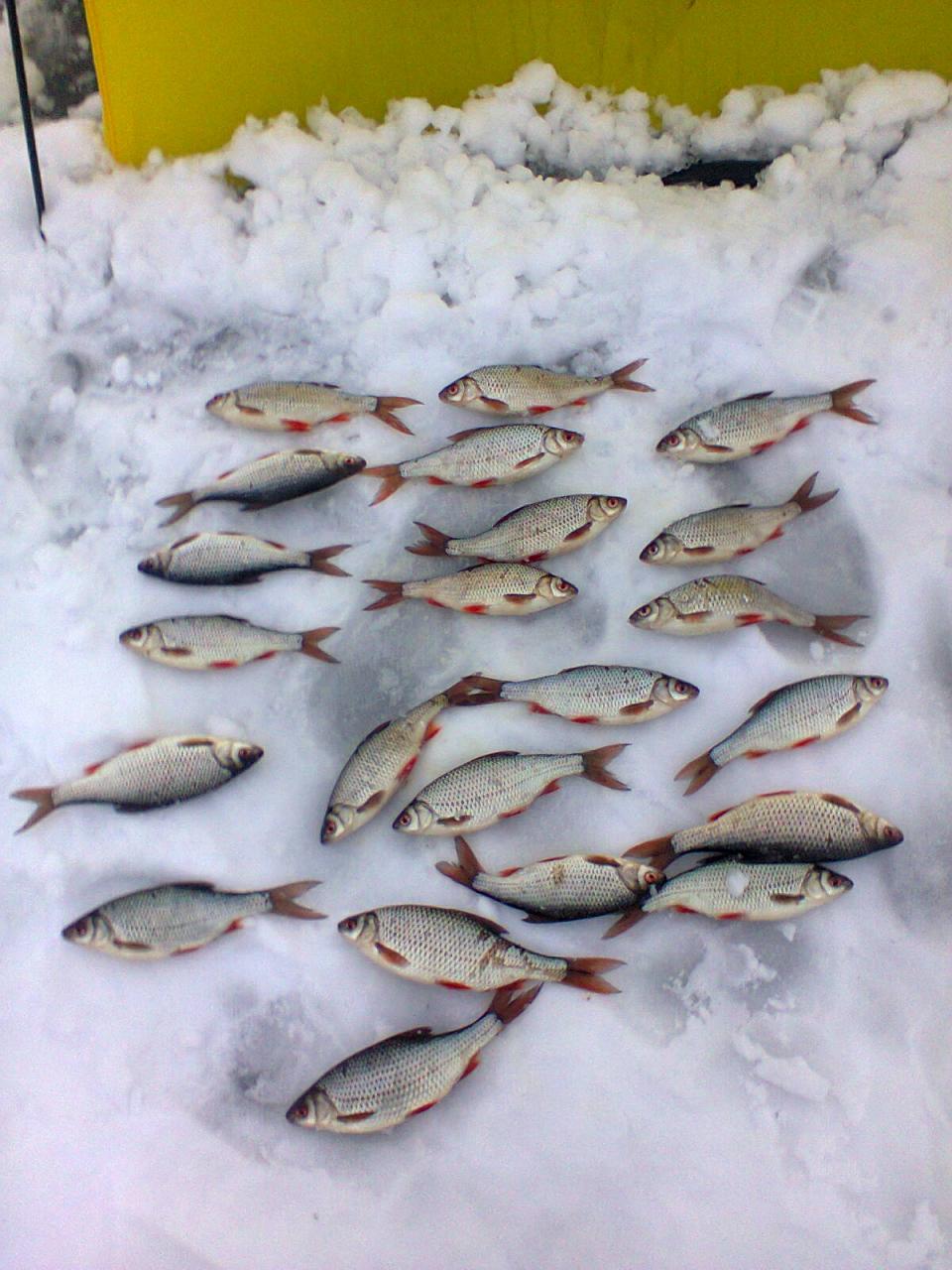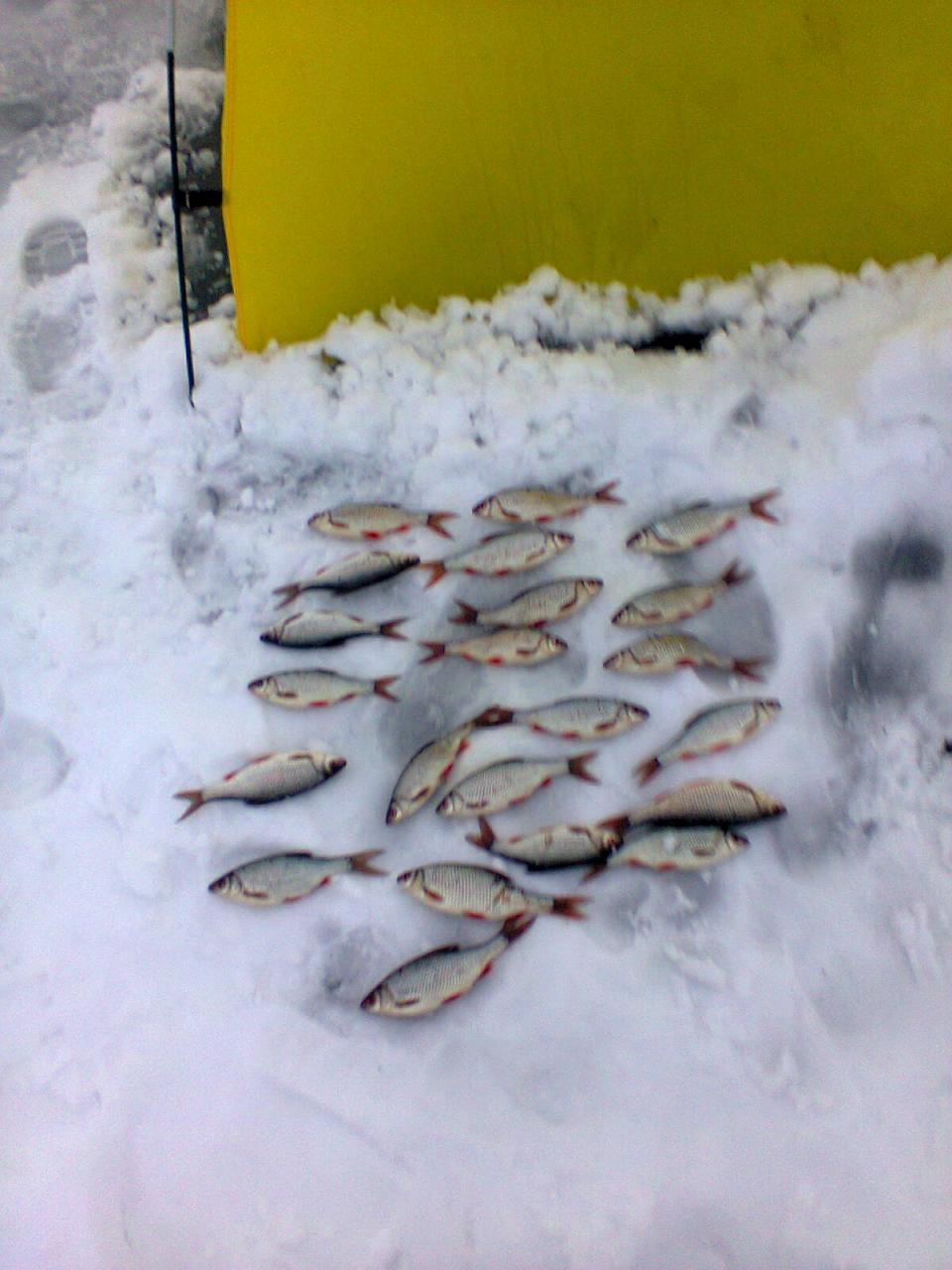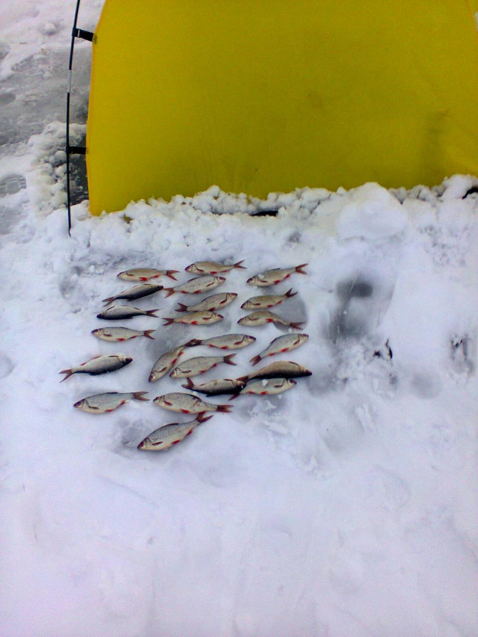 Выбирался вчера и сегодня на ММ, в одно и то же место. От краба, а потом куда глаза глядят:), где-то за руслом. По клеву, что вчера, что сегодня каждую рыбку приходилось вымучивать. Кормился траппер конкурс+свое+мотыль. Типо, на леща :) . В итоге, вчера 14 шт. плотвы + 2 бонуса 860г. и 910г, общий вес 3300. Сегодня 26шт. плотвы + 1 недобонус визуально гр. 250-300(не взвешивал), общий вес 2750. Все подлещики и половина плотвы были пойманы на микроболду, остальная плотва на микромормышку с тестом. Поклевки очень аккуратные, видно, что рыбка капризничает :(. Погодка(после вчерашней жестяги) сегодня порадовала:p. Был с товарищем, вчера у него примерно 1 кг, сегодня около 2 кг. плотвы насобирал. Вчера фотофиксатор не взял, фото сегодняшнего улова: