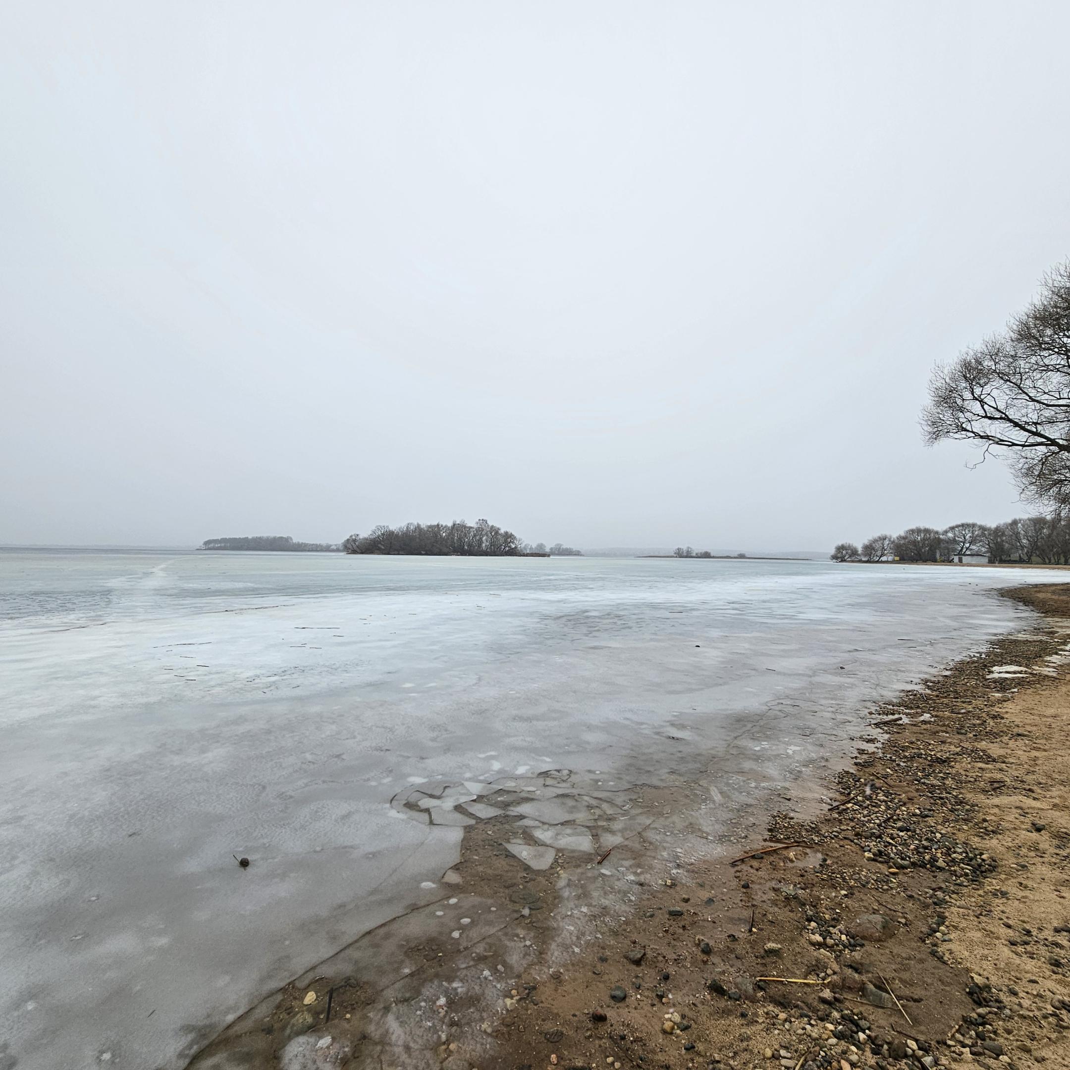 Воодушевленный вчерашней вечерней разведкой восточной части, сегодня с утра приехал на пятый пляж.На стоянке было три машины, по свежим следам от рыбацких санок,я направился к островам.Пройдя 150 метров слева увидел темное пятно, достал из санок бур, а лёд четыре сантиметра.Вернулся,бур оставил в машине, взял пешню. Льда нет.Пять,четыре см., впереди видел троих рыбаков,может им и три см.норма?Пойдзе,пойдзе стрэлкай белай паплавок у дно.Ты рукою загарэлай схопiш вудзiльно.