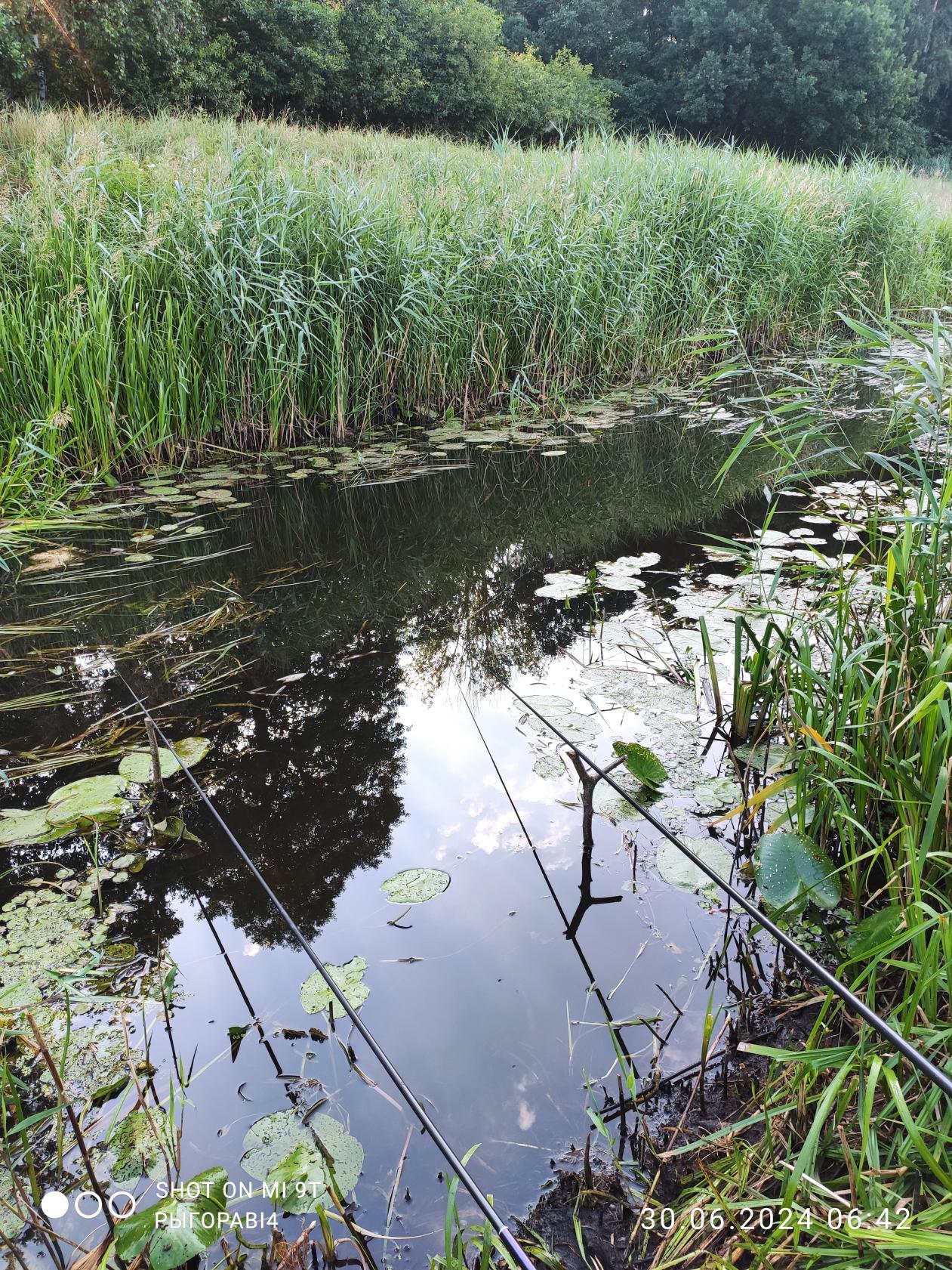 В последние выходные июня выезд на канаву не планировался, но состоялся)) В субботу к обеду припер на маршрутке за 250км и сразу на велике погнал на канаву чистить место. Прошелся по воде метров триста, на этот раз в сапогах)) Вода упала на 15-20 см, течение почти не чувствуется. На дне местами твердый ил, местами сапропель, местами твердое дно с глубиной по пояс или по колено. Казалось бы канава, а она разная) В итоге дочистил предыдущее свое карасевое место и почистил новое на целине так сказать, с твердым илом на дне, но котором так и не половил( Воскресенье утро. В четыре, по уже традиции, я на месте. Сел там, где клевало на предыдущей рыбалке. На этот раз решил схитрить, так как карась больше клевал на мотыля с опарышем, то их же добавил и в корм. На полтора литра сыпухи 100г среднего мотыля и 50г опарыша. И, можно сказать, на этом я обделался)) Собралось все. Куча мелкой густеры, красноперки, плотвичек, окуньков и даже поймал там первого подлещика. И клевали они в этот раз на все и пока не поднялось над лесом солнце. Потом в полярики увидел, сколько там стоит в воде этой мелочи и обалдел. Не понятно, как я в прошлый раз ловил и она меня почти не беспокоила. Пришел к выводу, что мотыль в прикормке сотворил зло. Или может резаный червь раньше отпугивал?