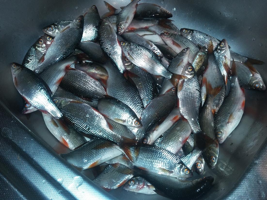 • Сегодня на рыбозаградителе был полный аншлаг !!! Столько народа я ещё здесь не видел ! Народ сидел плотненько от пантонов до насосной по обоим берегам !!! Мы приехали в 6-30 и поняли , что проспали ! На стоянке мест уже небыло и машины стояли почти по всей дороге ! Перешли мы через мостик и пристроились между рыбаками . Я как всегда ловил на макароны , товарищи - на перловку . Перловка сегодня нравилась рыбке больше ! На перловку и плотвичка покрупнее и товарищ поймал 8 иных рыбок , я тоже поймал 5 штук , таких я раньше не ловил ! Насчёт названия их , мнения разделились - одни говорят что это голавлики , другие говорят - подъязики ! Рыбки красивые , с красными плавниками и большим ртом ! Почти все одного веса , по 150г. Плотвы поймал 62 шт. Общий вес 4кг. 400г. Товарищи поймали по столько же ! Очень мешал ловле сильный боковой ветер ! Ловили махами 7 м. Уехали в 17-30 .